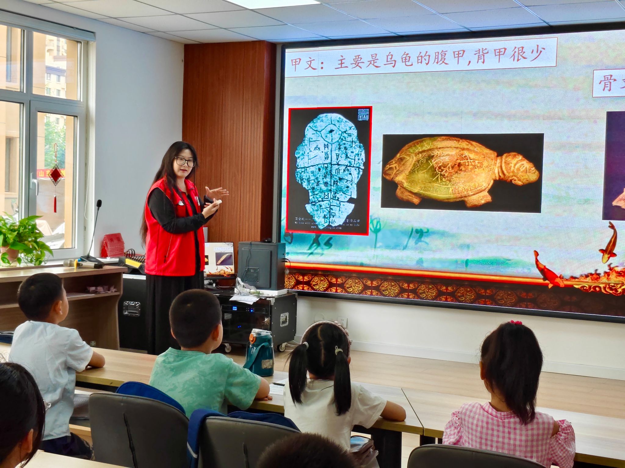 活动现场,志愿者以生动形式为孩子们讲解甲骨文的起源、特点及演变。借助大屏展示甲骨实物与文字图案,从龟甲兽骨的“前世今生”,到甲骨文如何“画”出天地万物,志愿者们深入浅出地解析,让孩子们直观感受甲骨文的独特魅力。