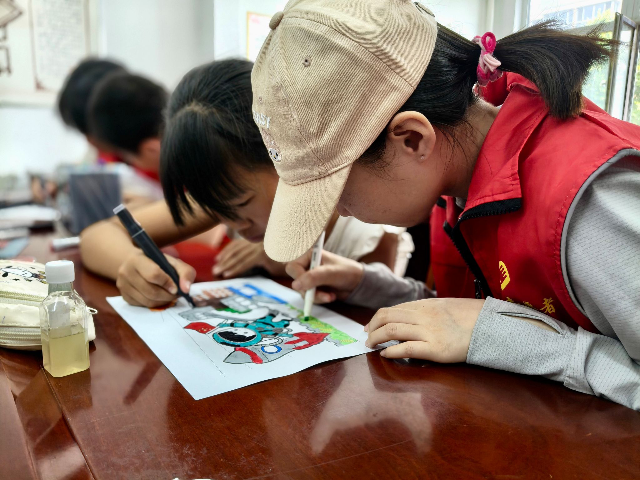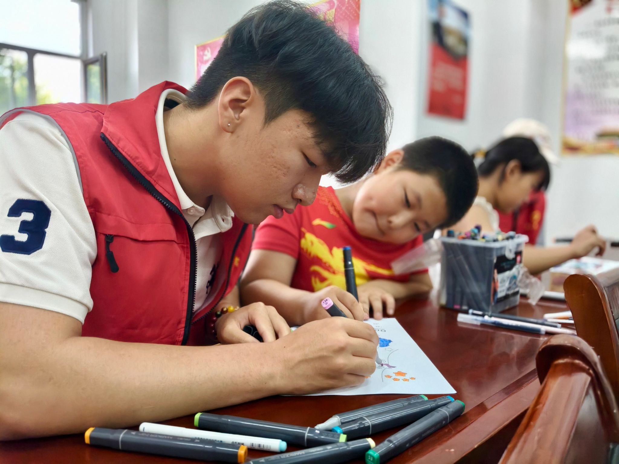 随后的绘画创作环节,成为孩子们抒发爱党情感的舞台。志愿者与孩子们并肩而坐,一同拿起画笔,以“童心向党” 为创作主题,勾勒党员徽章、五星红旗,描绘祖国发展新貌。创作过程中,志愿者耐心指导,鼓励孩子们发挥想象力,用色彩传递对党的崇敬与对新时代的憧憬。一幅幅作品,或展现党的光辉历程,或描绘祖国繁荣景象,生动诠释着孩子们对党和国家的真挚情感。