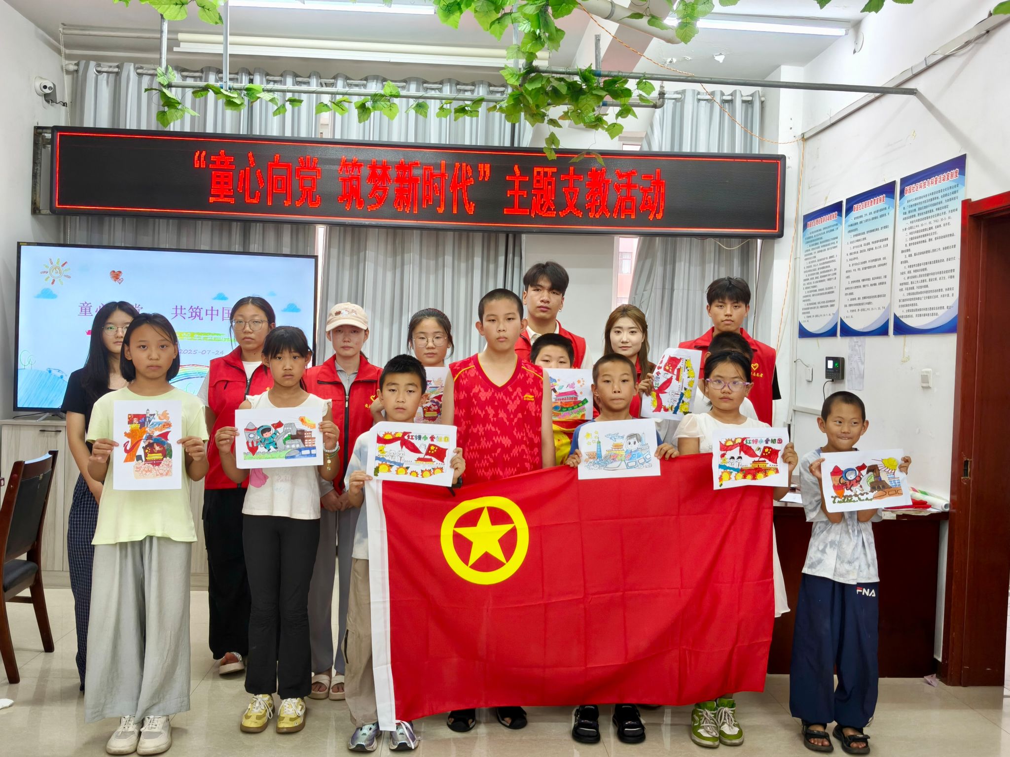 活动尾声,孩子们手持创作画作,与志愿者共同展示成果。鲜艳的党旗映衬下,孩子们脸上洋溢着自信的笑容,彰显出新时代少年积极向上的精神风貌。此次主题支教活动,不仅让党的理论知识“童”趣化落地,更以实践创作激发青少年爱党爱国热情,助力他们在成长路上筑牢信仰根基,勇担时代使命。