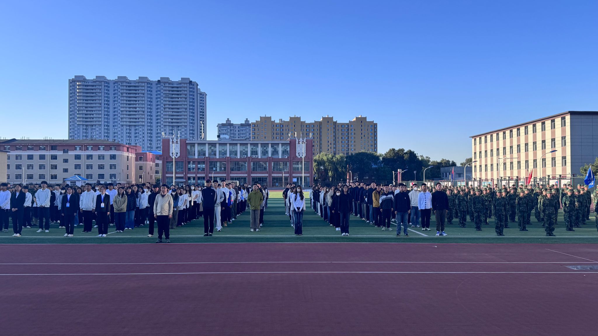 早晨7时升旗仪式正式启动。伴着雄壮的《义勇军进行曲》,五星红旗缓缓升起,全体师生肃立行注目礼,目光紧紧追随迎风展扬的国旗,心中满溢对祖国的无限热爱与崇高敬意。