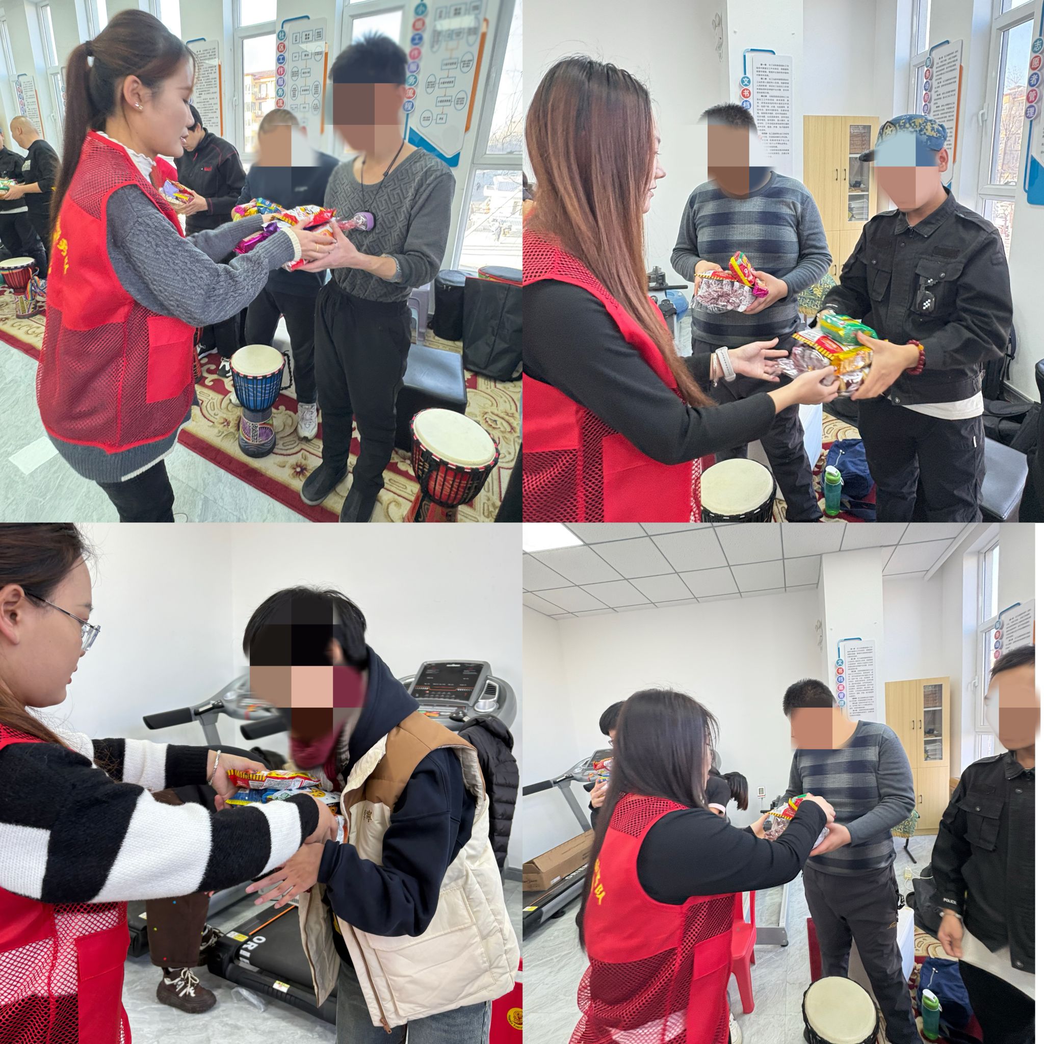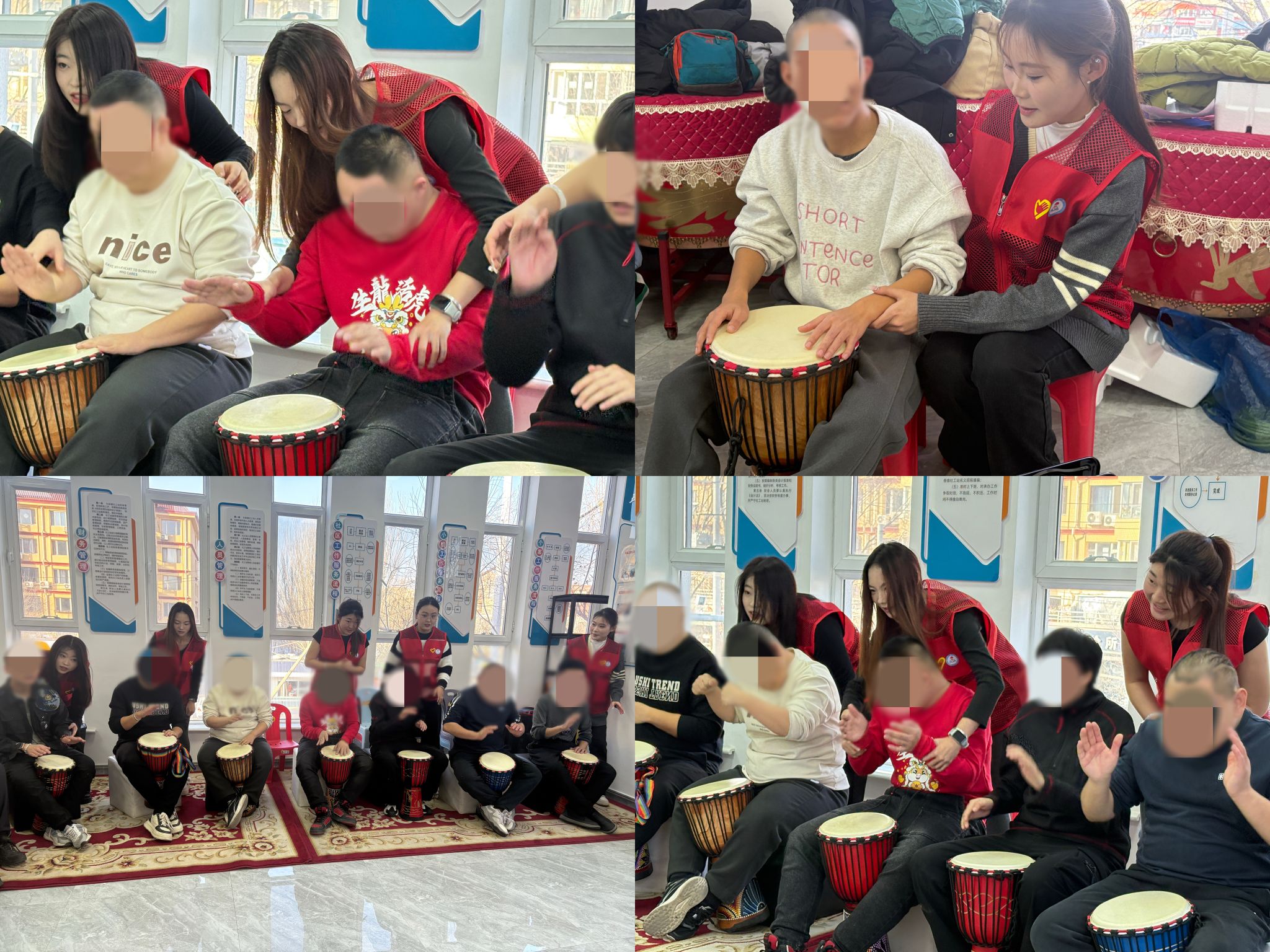 志愿者们耐心示范击鼓的节奏与手法,亲自指导参与者们感受鼓点的韵律,从操作生疏到渐趋合拍,现场的欢笑声与鼓点声相互交织,汇聚成了温暖的乐章。特殊人群在击鼓过程中释放了活力,脸上洋溢着灿烂的笑容。部分参与者稍显拘谨,鼓点节奏时快时慢,甚至有些跟不上节拍。志愿者们见此情形,即刻采用“一对一”的帮扶方式,俯身立于参与者身旁,亲自纠正其姿势,引领他们体会手腕发力的程度,耐心引导他们跟上集体的节奏。击鼓互动结束后,志愿者们为在场的每一位特殊人群送上了精心筹备的爱心零食礼包。接过礼包的瞬间,众人脸上均绽放出纯真的笑容,有的参与者还主动拉住志愿者的手,用不太清晰的话语表达“谢谢”。这简单的两个字,令在场的志愿者们内心一暖,深切体会到了此次志愿服务活动的意义与价值。