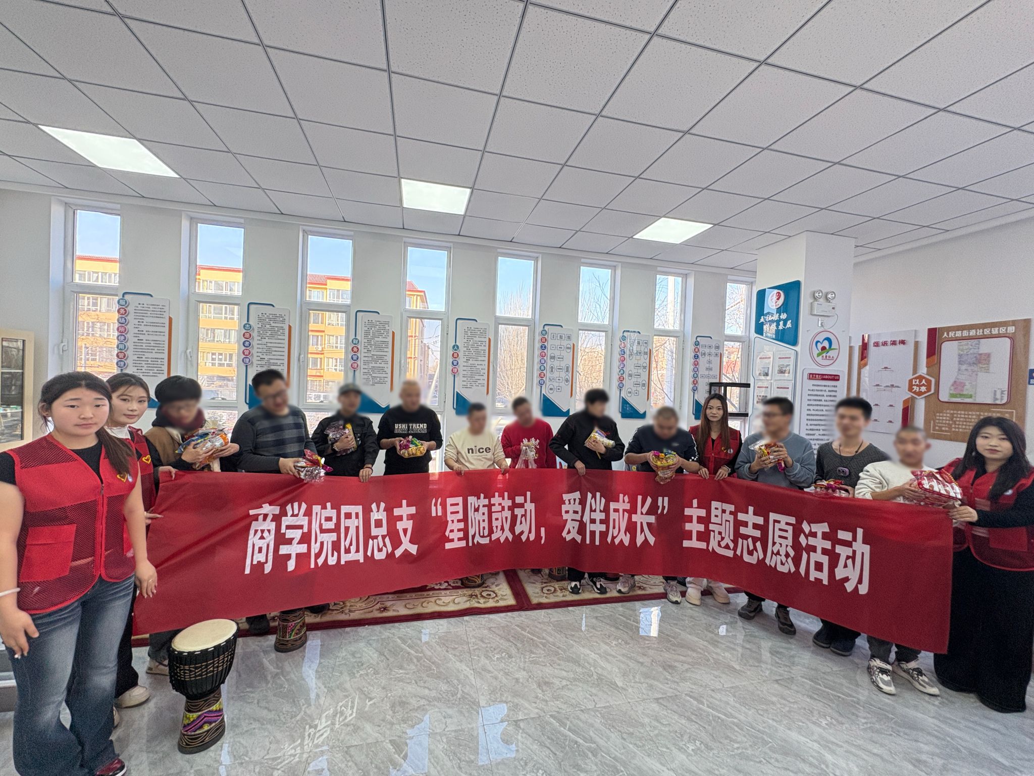 在第 40 个国际志愿者日来临之际,为大力弘扬“奉献、友爱、互助、进步”的志愿服务精神,切实履行青年组织的社会责任,传递对特殊群体的关怀与温暖,12 月 7 日,商学院团总支组织学院发展团员、入党积极分子、发展对象等 17 名青年志愿者前往仕奇社区党群活动中心开展“星随鼓动,爱伴成长”主题志愿活动,以鼓点奏响欢乐乐章,以爱心点亮温暖时光。