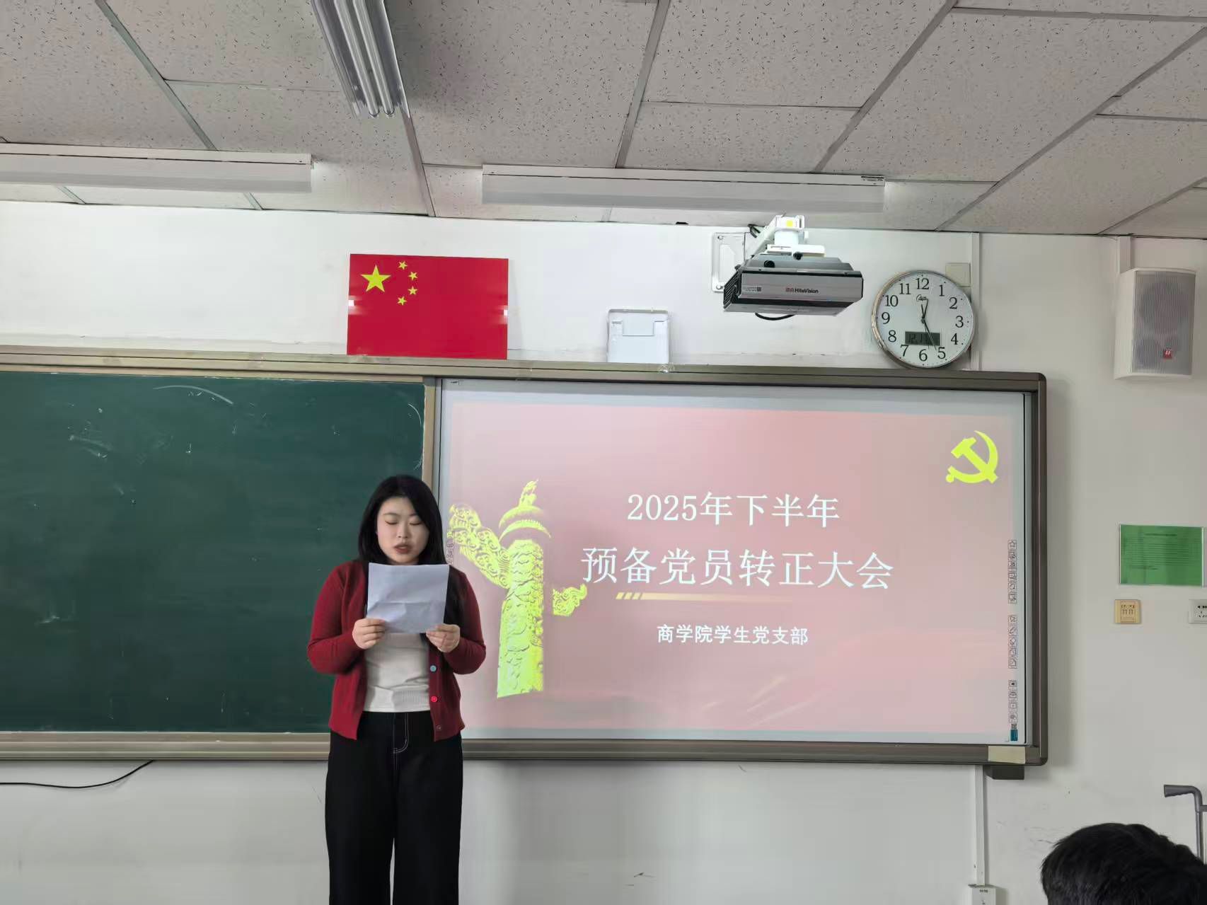 为进一步强化党组织建设,为党组织注入新鲜力量,2025年12月17日,商学院学生党支部于尚智楼312教室召开2025年下半年预备党员接收大会。学院学生第一、第二党支部书记樊寒伟、华国庆,组织委员边雨桐、曹国利出席此次会议,全体学生党员以线上线下相结合的方式全部参与会议。
