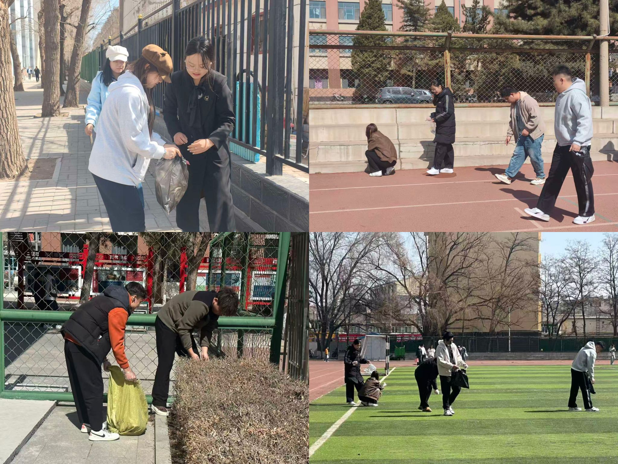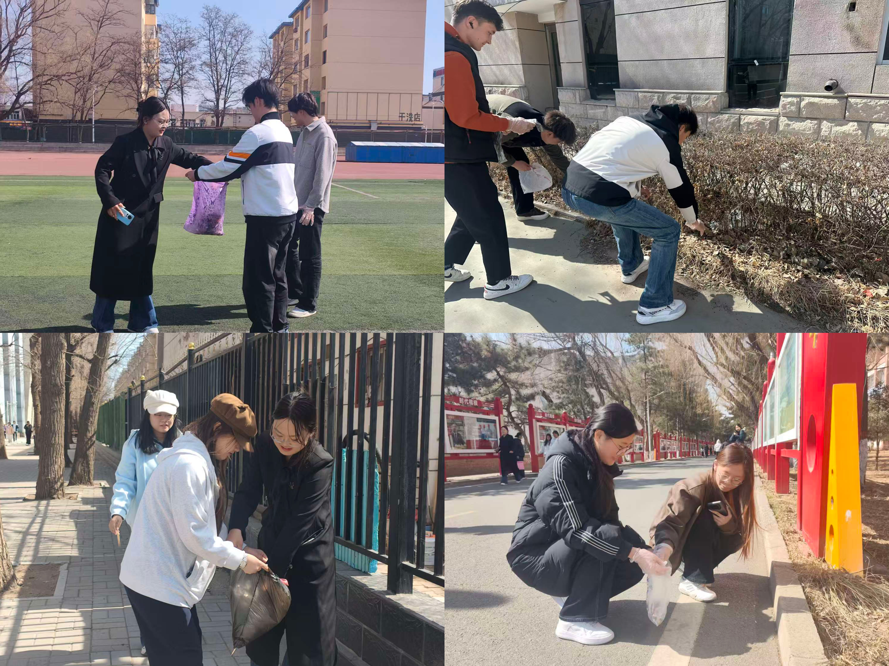 志愿者们赴东门时代楷模展栏、北院操场、林楼后侧区域、篮球场及排球场、尚智楼教室和南苑操场开展清扫工作。他们手持夹子与垃圾袋,对街道两侧绿化带、墙角缝隙以及操场角落展开全面且细致的清理,着重清除烟头、塑料瓶、包装袋等垃圾,同时助力维护周边公共设施。他们对堆放杂乱的物品予以整理,彻底消除卫生死角,为师生营造干净、安全的通行与活动环境。