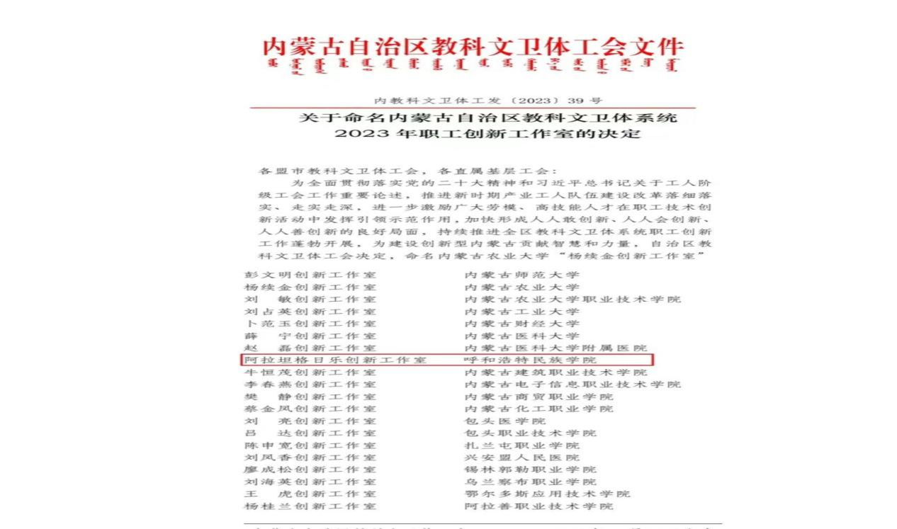 阿拉坦格日乐创新工作室被命名为自治区教科文卫体系统职工创新工作室。