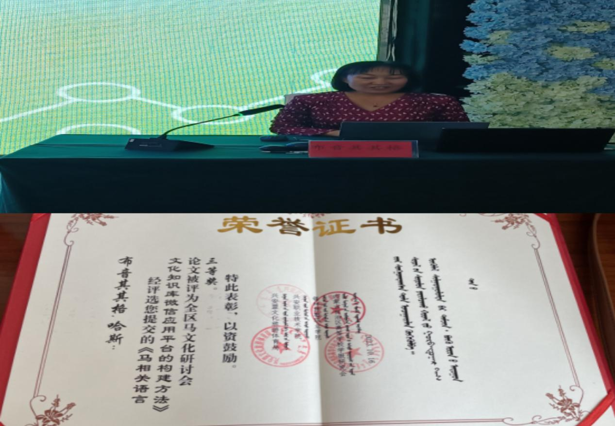 米乐官网教师布音其其格参加全区马文化研讨会,并提交的论文“马相关语言文化知识库微信应用平台的构建方法”被评为全区马文化研讨会三等奖,并在大会上宣读了论文。