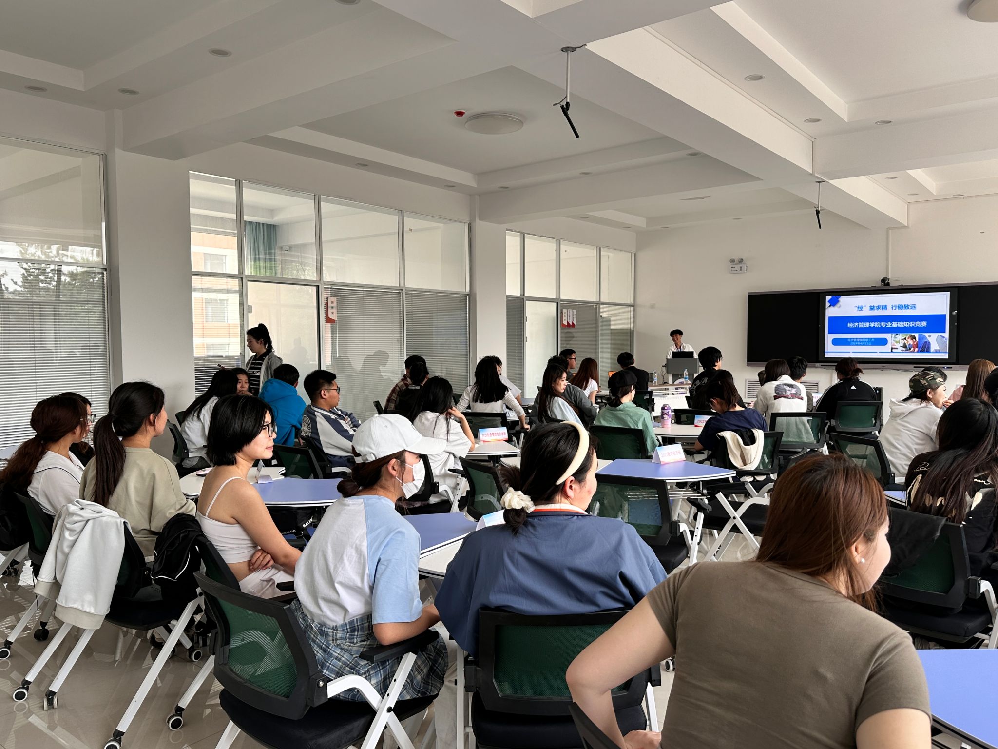 为切实贯彻教书育人、管理育人、服务育人的教育理念,进一步夯实专业基础知识,营造良好的校园文化氛围,增强学生的自我学习、自我提升意识,丰富大学生课外文化生活,加强米乐官网的文化建设内涵,经济管理学院学工办以“‘经’益求精,行稳致远”为主题,于4月25日下午在创业楼二楼活动室举办学院第一届专业基础知识竞赛。全院非毕业班共组成16个队伍参赛,参赛选手共计48人。经济管理学院专任教师苏都、阿古达木,辅导员边雨桐、曹国利到场观赛。