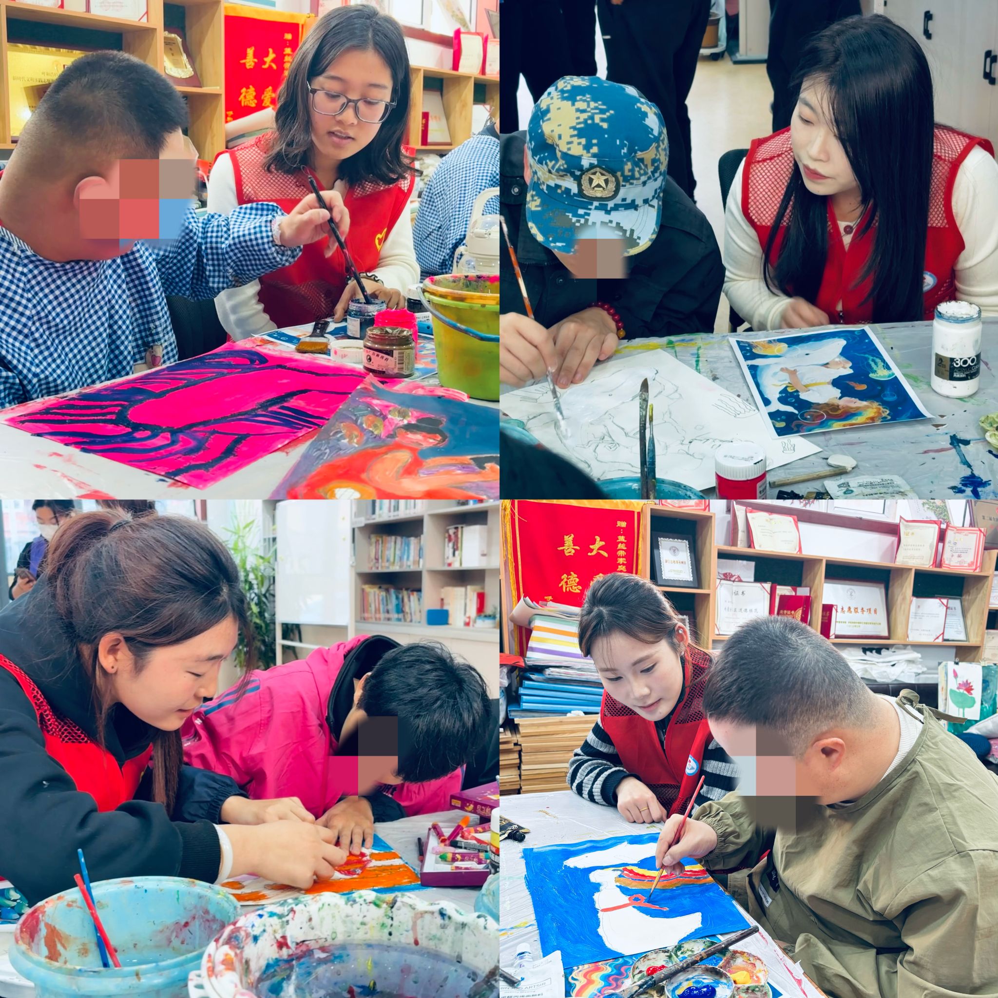 前期策划中,商学院团总支精心采购了品类丰富的绘画工具和健康美味的爱心零食。活动开始时,志愿者们积极主动地与特殊人群儿童进行深入接触,通过亲切的问候和笑容,迅速打破了初次见面时的陌生与拘谨局面。开展过程中,志愿者们俯身贴近,认真协助参与者调整握笔姿势,手把手地引导他们勾勒线条;针对那些对色彩充满好奇的参与者,志愿者们详细讲解色彩搭配的实用技巧,鼓励他们大胆发挥创新创意;对于性格内向、不善表达的参与者,志愿者们则轻声细语地交流沟通,从其感兴趣的话题切入,逐步激发他们的绘画热情。绘画完成后,志愿者们将精心准备的爱心零食逐一发放到每一位参与者手中。大家手捧着香甜的零食,脸上洋溢着幸福而满足的喜悦笑容。