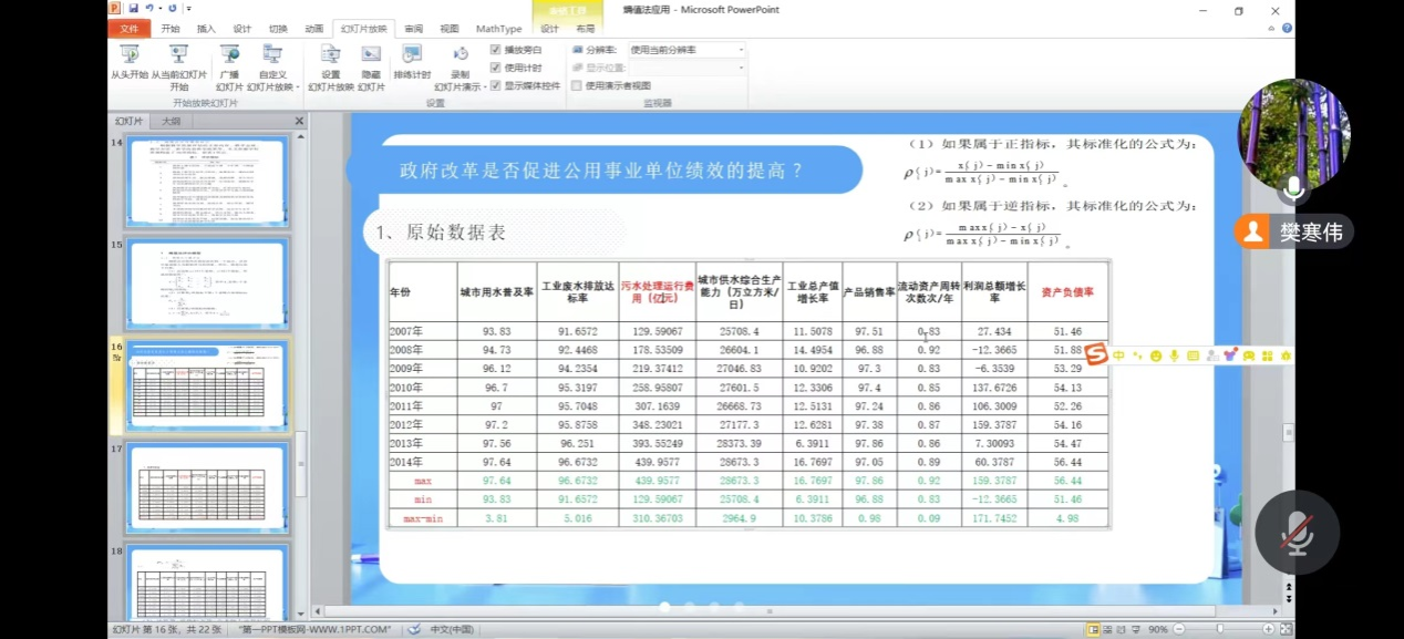 樊寒伟老师结合个人教学、科研实践,对经管类论文常用到的评价类模型做了简要介绍,具体讲解了熵值法在学生毕业论文的应用,特别是熵值法权重如何在Excel中的实现,并在讲解中进行实际的演示。