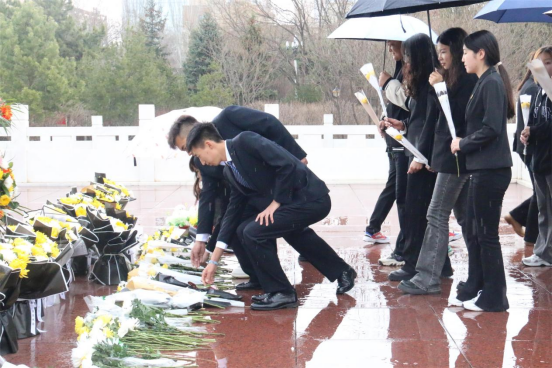 在纪念碑前,师生胸戴党徽、团徽,手捧寄托哀思的黄白菊花,在乌兰夫雕像前默哀,缅怀先烈的丰功伟绩,表达自己的无限敬意和哀思。