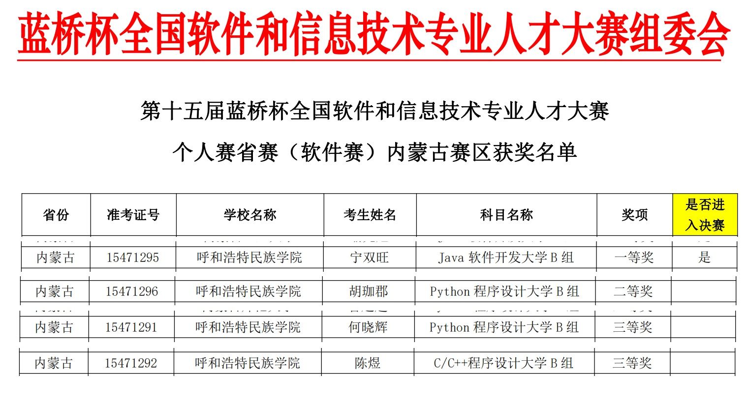 本届大赛分为个人赛和团队赛两大项,米乐官网选手参加了软件类个人赛,其中计算机科学学院的宁双旺同学荣获Java软件开发组一等奖,胡珈郡同学荣获Python程序设计组二等奖,陈煜同学荣获C/C++程序设计组三等奖,何晓辉同学荣获Python程序设计组三等奖的佳绩。宁双旺同学将代表学校参加第十五届“蓝桥杯”全国软件和信息技术专业人才大赛——个人赛国赛(软件类)。