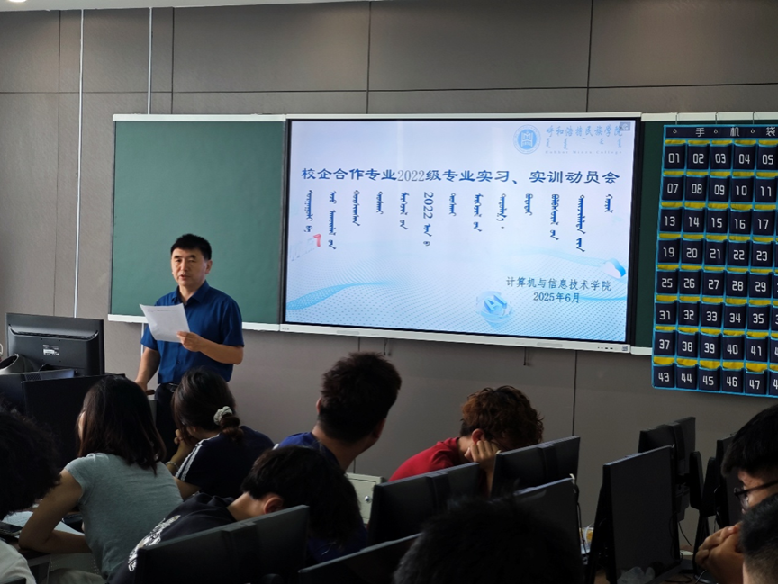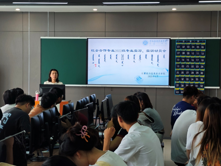 2025年6月30日上午,米乐官网于综合楼801教室召开了2022级校企合作专业实习实训动员会。动员会由学院党总支书记王水英主持,院长包乌格德勒、副院长色登丹巴、2022级校企合作专业班主任秦鹏和李海军、网络工程专业负责人姚浩斯拉、企业实习实训负责人云诗仪和亢迪,以及2022级数据科学与大数据技术、网络工程专业全体学生共80余人参加。