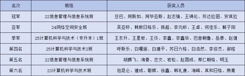 经过多轮激烈的角逐,最终2022级信息管理与信息系统班摘得冠军,2024级网络空间安全获得亚军,2025级计算机科学与技术专升本1班获得季军,2025级计算机科学与技术2班获得殿军。