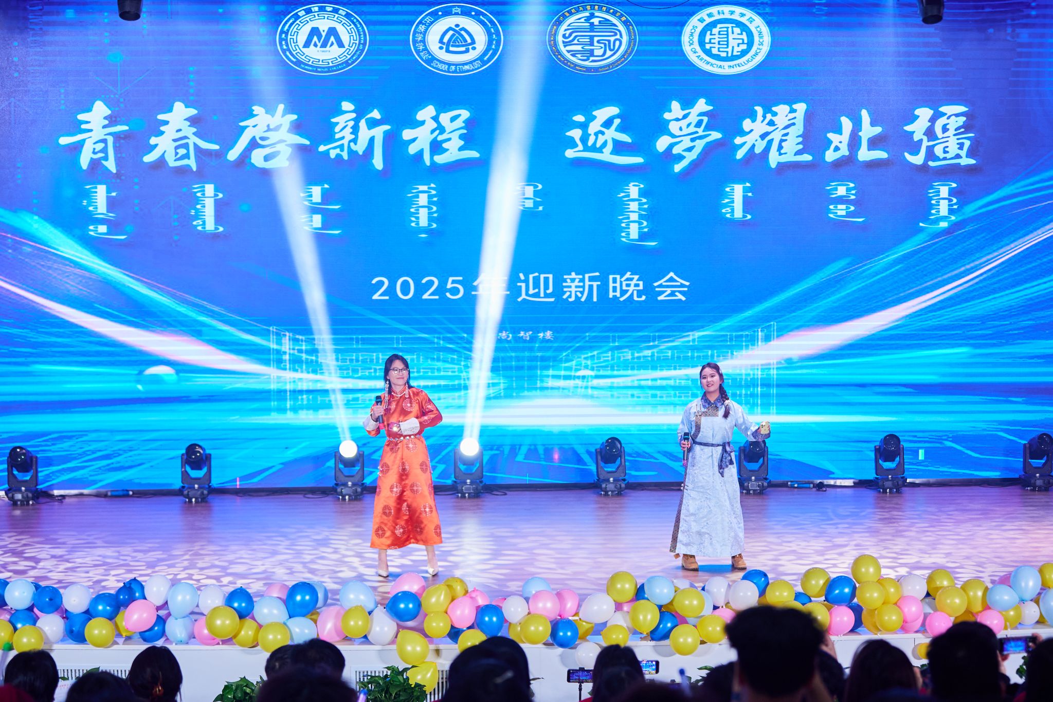 为深入学习贯彻习近平新时代中国特色社会主义思想和党的二十大、二十届四中全会精神,积极迎接2025级新生,引导青年学子进一步“感党恩、听党话、跟党走”,展现青年学子蓬勃向上的青春风貌与担当,2025年11月27日晚,由管理学院、民族学学院、计算机与信息技术学院、智能科学学院联合举办的“青春启新程 逐梦耀北疆”2025年迎新晚会在铸牢教育馆二楼报告厅盛大启幕。各学院党总支书记、院长、各科室负责人、班主任、辅导员代表、2025级新生出席晚会,共同见证这场青春盛会。