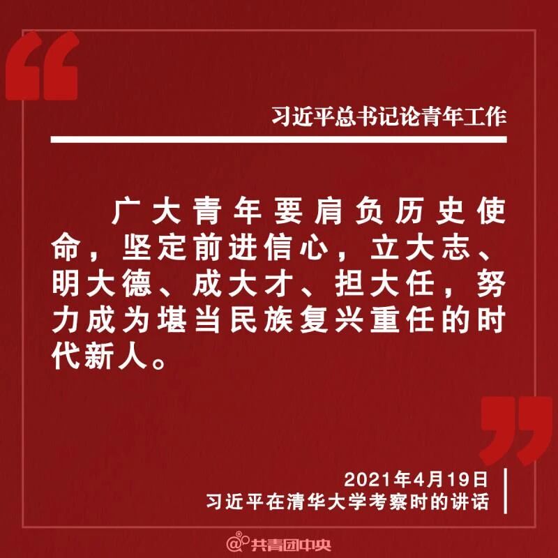 “我相信,当代中国青年一定能够担当起党和人民赋予的历史重任,在激扬青春、开拓人生、奉献社会的进程中书写无愧于时代的壮丽篇章!”总书记勉励广大青年。
