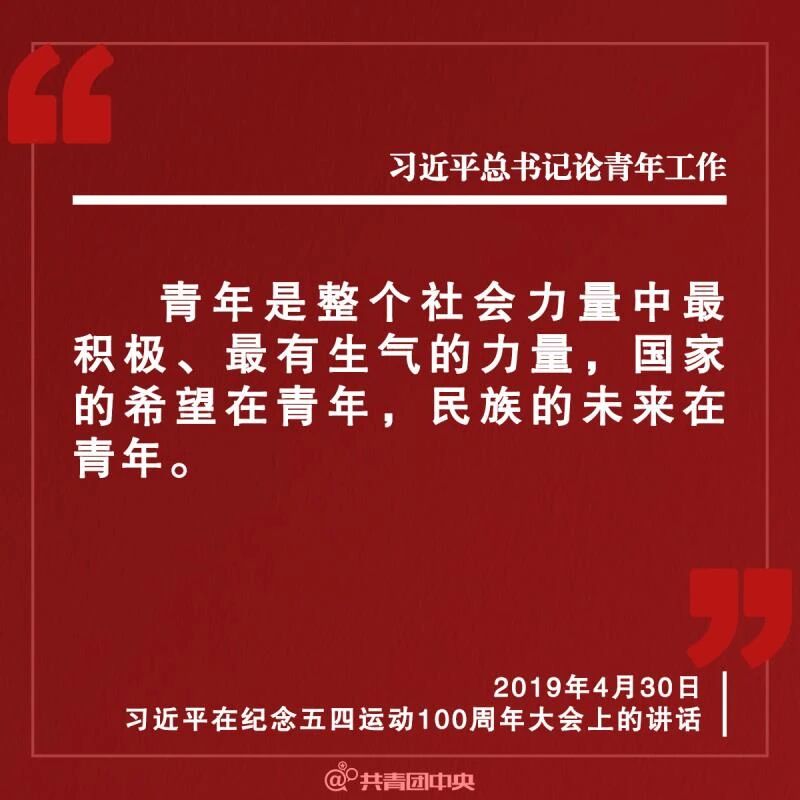 “在革命、建设、改革各个历史时期,中国共产党始终高度重视青年、关怀青年、信任青年,对青年一代寄予殷切期望。中国共产党从来都把青年看作是祖国的未来、民族的希望,从来都把青年作为党和人民事业发展的生力军,从来都支持青年在人民的伟大奋斗中实现自己的人生理想。”2013年5月4日,习近平总书记在同各界优秀青年代表座谈时指出。
