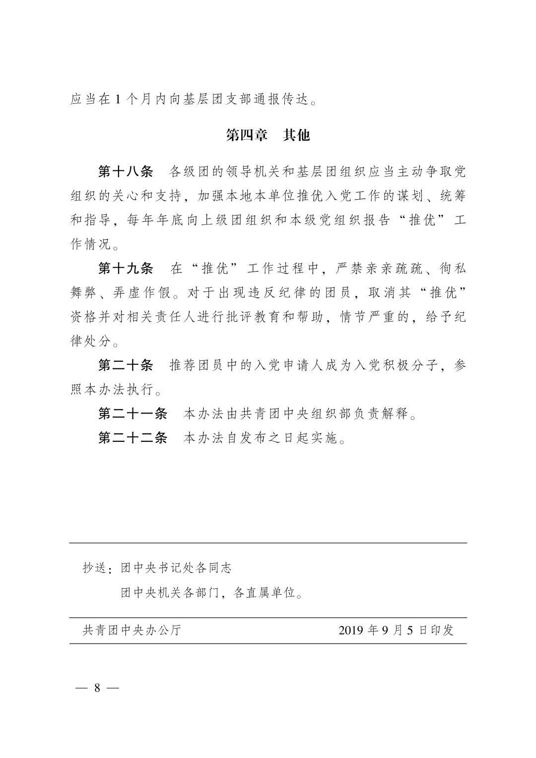 第十九条 在“推优”工作过程中,严禁亲亲疏疏、徇私舞弊、弄虚作假。对于出现违反纪律的团员,取消其“推优”资格并对相关责任人进行批评教育和帮助,情节严重的,给予纪律处分。