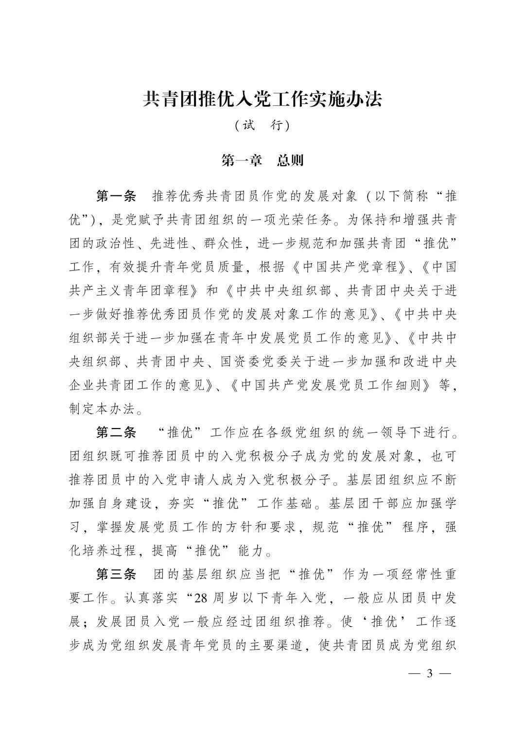 第三条 团的基层组织应当把“推优”作为一项经常性重要工作。认真落实“28周岁以下青年入党,一般应从团员中发展;发展团员入党一般应经过团组织推荐。使‘推优’工作逐步成为党组织发展青年党员的主要渠道,使共青团员成为党组织发展青年党员的主要来源”的要求。28至35周岁青年入党,一般应听取所在单位或所在地团组织意见。