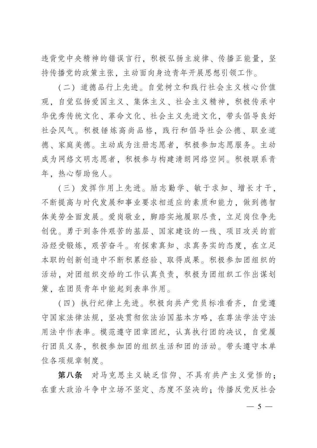 (二)道德品行上先进。自觉树立和践行社会主义核心价值观,自觉弘扬爱国主义、集体主义、社会主义精神,积极传承中华优秀传统文化、革命文化、社会主义先进文化,带头倡导良好社会风气。积极锤炼高尚品格,践行和倡导社会公德、职业道德、家庭美德。主动成为注册志愿者,积极参加志愿服务。主动成为网络文明志愿者,积极参与构建清朗网络空间。积极联系青年,热心帮助他人。
