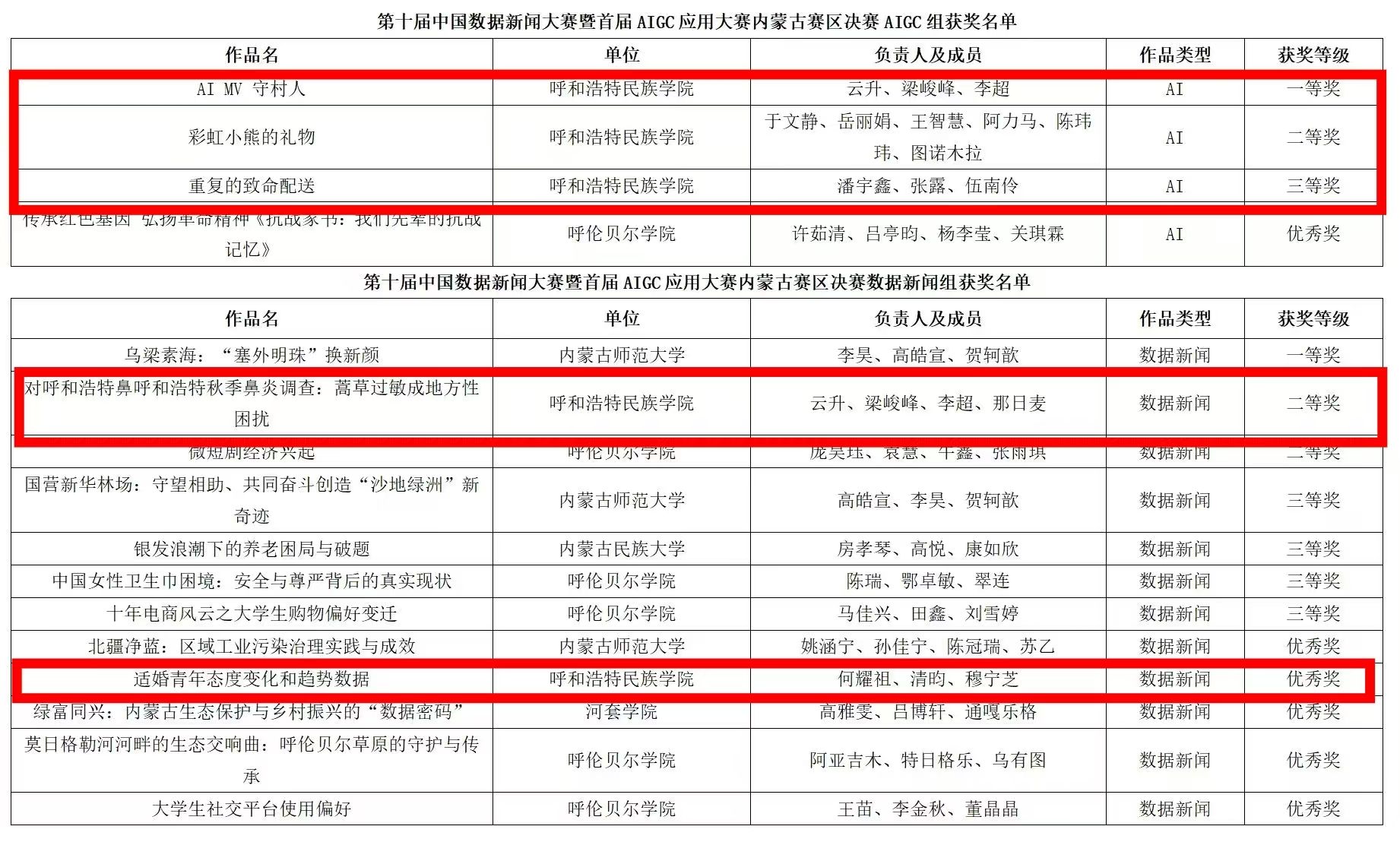 云升、梁峻峰、李超、那日麦同学创作的《对呼和浩特秋季鼻炎调查:蒿草过敏成地方性困扰》获得数据新闻组内蒙古赛区二等奖;何耀祖、清昀、穆宁芝创作的《适婚青年态度变化和趋势数据》获得优秀奖。所有获奖作品均由网络与新媒体专业的梁翠莲、阿特尔、王倩茹三位老师共同指导。