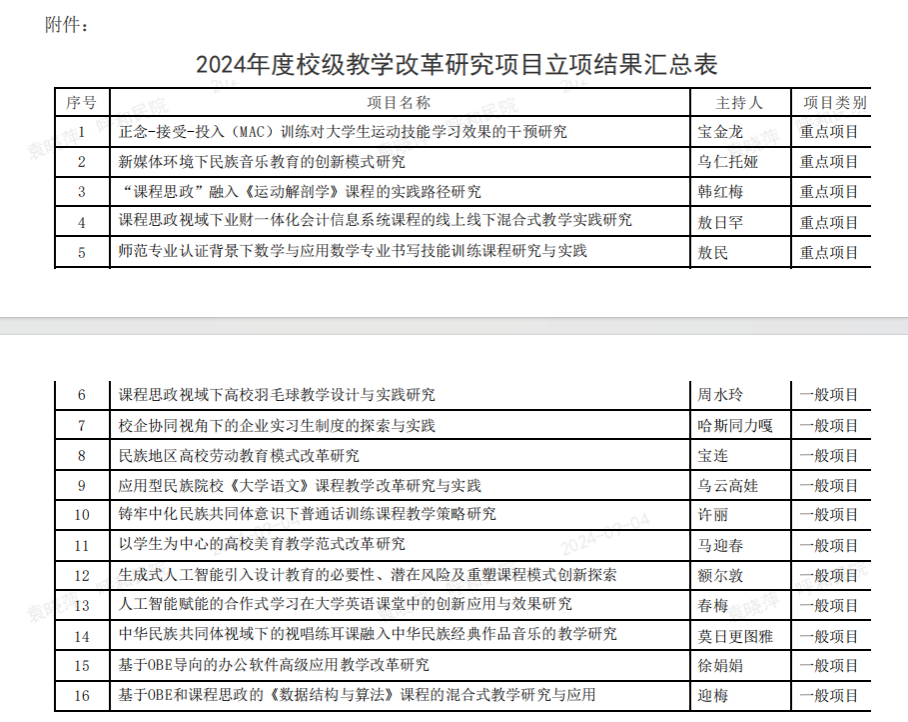 附件:2024年度校级教学改革研究项目立项结果汇总表