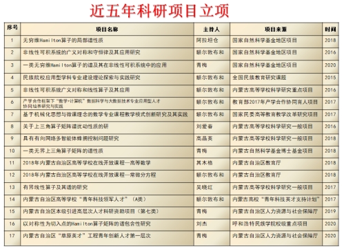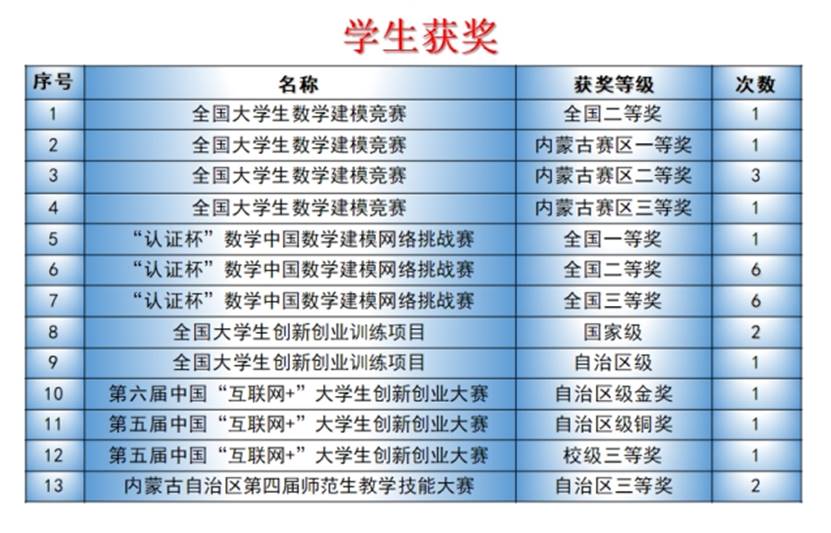 天道酬勤,一树百获。近几年,该专业师生先后获得全国高校数学微课程教学设计竞赛全国一、二等奖;全国大学生数学建模竞赛二等奖等50多项省部级各类奖项;现有自治区高等学校在线开放课程2门(2018年)和精品在线开放课程(金课)1门(2021年);建设自治区高等学校实验教学示范中心(2017年)1个和教育部民族教育发展中心重点研究基地(2015年)1个,挂靠学校成立内蒙古高等教育学会数学教育分会(2016年);先后20多名学生考取太原理工大学、陕西师范大学、内蒙古大学等高校硕士研究生,其中3人分别直推为武汉科技大学和内蒙古大学的博士研究生。特别是,2018年实现学校高等教育自治区级教学成果一等奖零的突破。