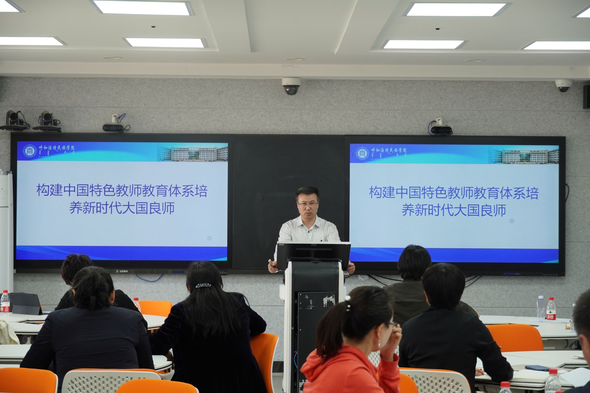 额尔敦布和以《构建中国特色教师教育体系培养新时代大国良师》为题作了专题辅导讲座,并就师范类专业认证工作提出三点意见:一是要以“认证标准”为尺度,全面部署师范类专业认证工作;二是要以“主线与底线”为抓手,系统梳理佐证材料和问题清单,按时完成自查自评和整改工作;三是要以“五个度”为准线,全链条整体推进参与认证和整改工作。