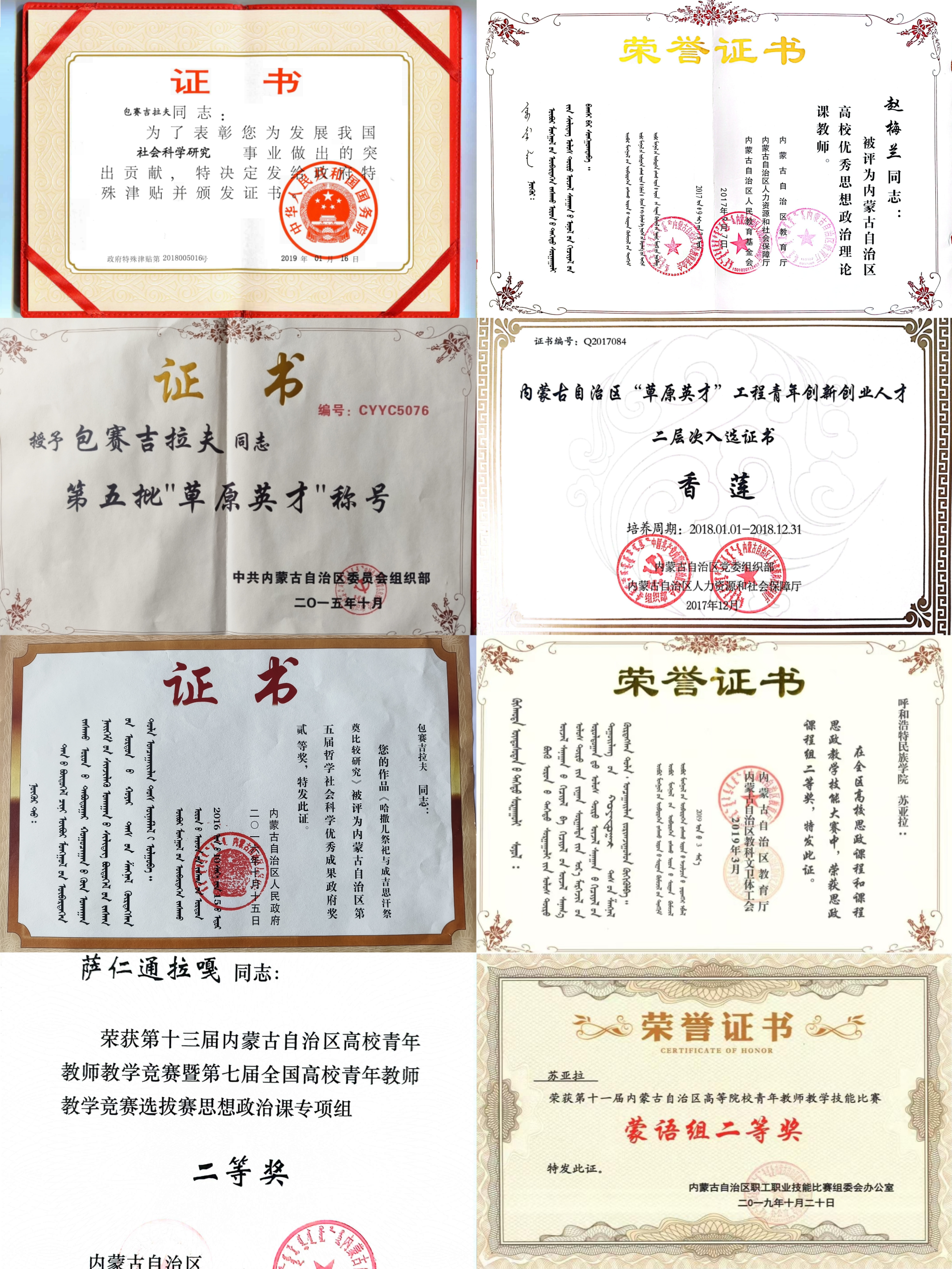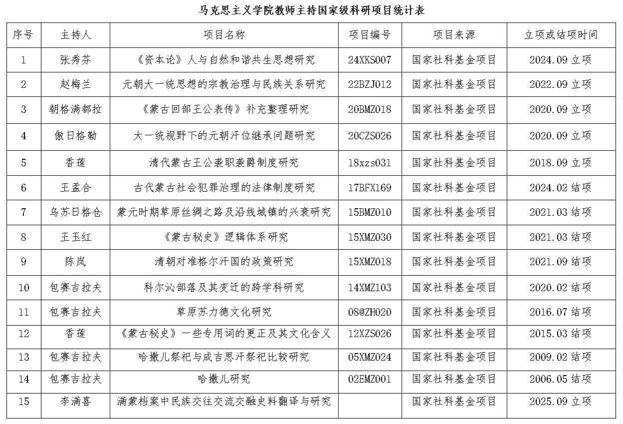 目前,学院拥有一批学位、年龄、职称合理的优秀教师团队。教职员工33人,其中教授6人,占比18.2%;副教授6人,占比18.2%;博士11人,占比33.4%;硕士20人,占比63.6% ,高层次人才储备充足;硕士生导师4人、校外兼职博士生导师1人、硕士生导师8人,特聘教授2人,银龄教师1人,为人才培养注入多元智慧。团队中涌现出一批国家级、省部级优秀人才:荣获全国优秀社科普及专家、享受国务院政府特殊津贴专家、自治区“草原英才”、自治区有突出贡献的中青年专家、内蒙古青年“五四奖章”、入选自治区意识形态领域“四个一批”人才、自治区新世纪“321人才工程”一层次人才、自治区高等教育“111工程”二层次人员1人;入选自治区草原英才创新创业人才、科技英才1人,自治区高校优秀思想政治理论课教师2人、自治区高校最美思政课教师、“尽职圆梦践行者”—北疆最美教师1人,自治区高校优秀辅导员1人,自治区高校党课名师1人,自治区高校铸牢中华民族共同体意识课程“示范性种子”教师2人,近五年获得全区高校思政课程和课程思政教学技能大赛二等奖1人,获得自治区高等院校青年教师技能大赛二等奖2人,自治区本科高校教师教学创新大赛中获得一等奖1人。学院始终坚持“以教促研,以研促教”的原则,不断推动教学科研发展。专任教师中主持国家社科项目13项,教育部一般项目3项,国家民委项目3项,省部级重点项目4项,一般项目40余项,出版专著9部,主编教材5部。获自治区哲学社会科学优秀成果二等奖3项,三等奖1项,建设自治区级一流课程1门、自治区在线课程1门、校级在线课程2门、省部级科研创新团队1个、校级科研创新团队3个,校级教学创新团队2个。