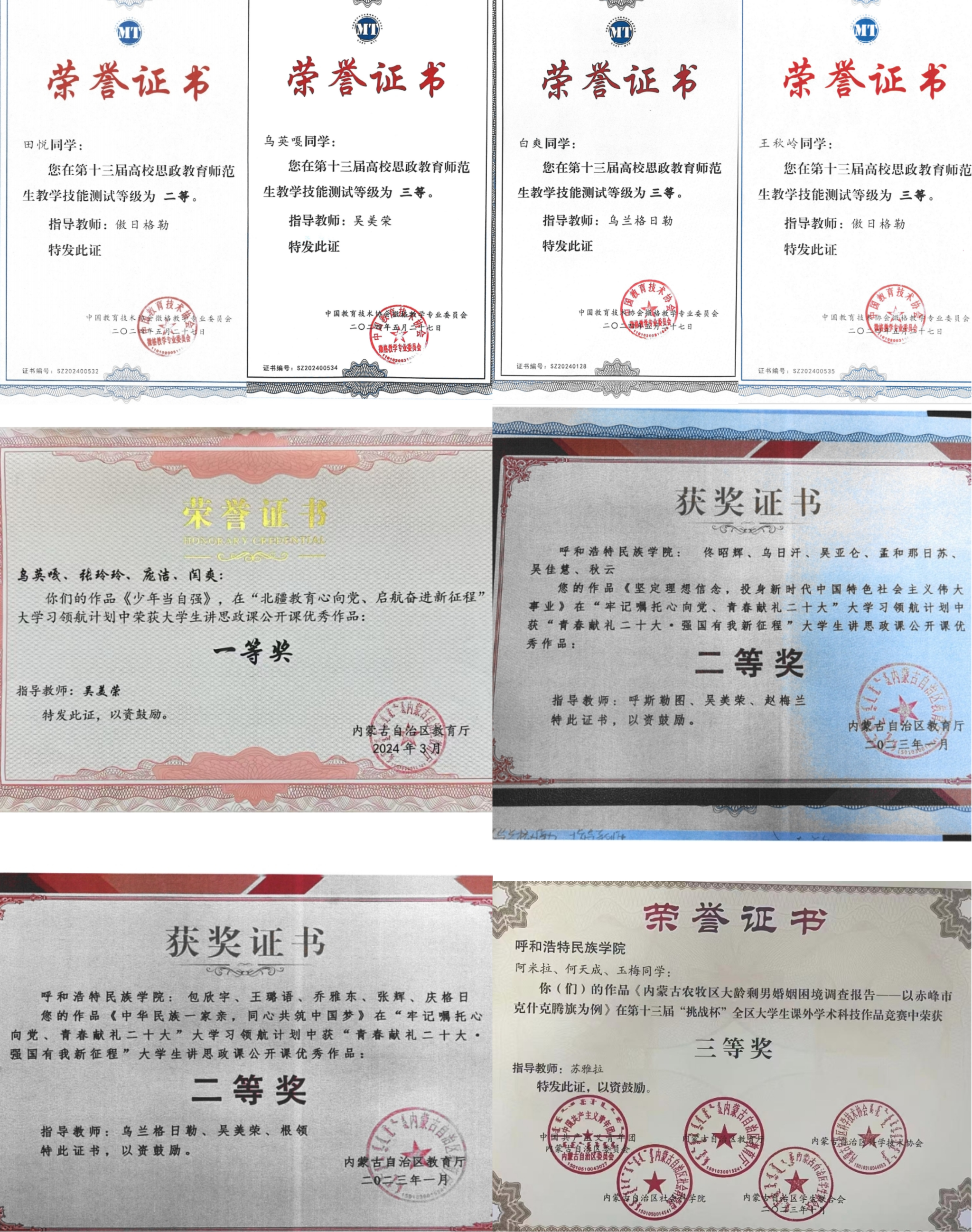 本专业注重实践性,在呼和浩特市、鄂尔多斯市鄂托克前旗、杭锦旗、兴安盟科右前旗、科右中旗、通辽市科左后旗、通辽市库伦旗设有28个实习(实训)基地,为学生提供了良好的实习、实训平台。近年来,本专业学生参加全国高校思政教育师范生技能测试暨微课比赛二等奖1人、三等奖5人;参加自治区大学生讲思政课比赛获一等奖2项、二等奖5项、三等奖5项;参加学校师范生技能大赛获得一等奖4人、二等奖3人、三等奖5人;参加“挑战杯”全区大学生创业计划竞赛获得三等奖3项;参加学校第六届互联网+大学生创新创业大赛获得三等奖1项,获批自治区级大学生创新创业训练项目4项,校级训练项目2项。2016级思想政治教育班获全国活力团支部奖,马克思主义学院志愿者服务队获得2019年全区大中专学生志愿者暑期“三下乡”社会实践活动“优秀志愿者服务队”等荣誉。