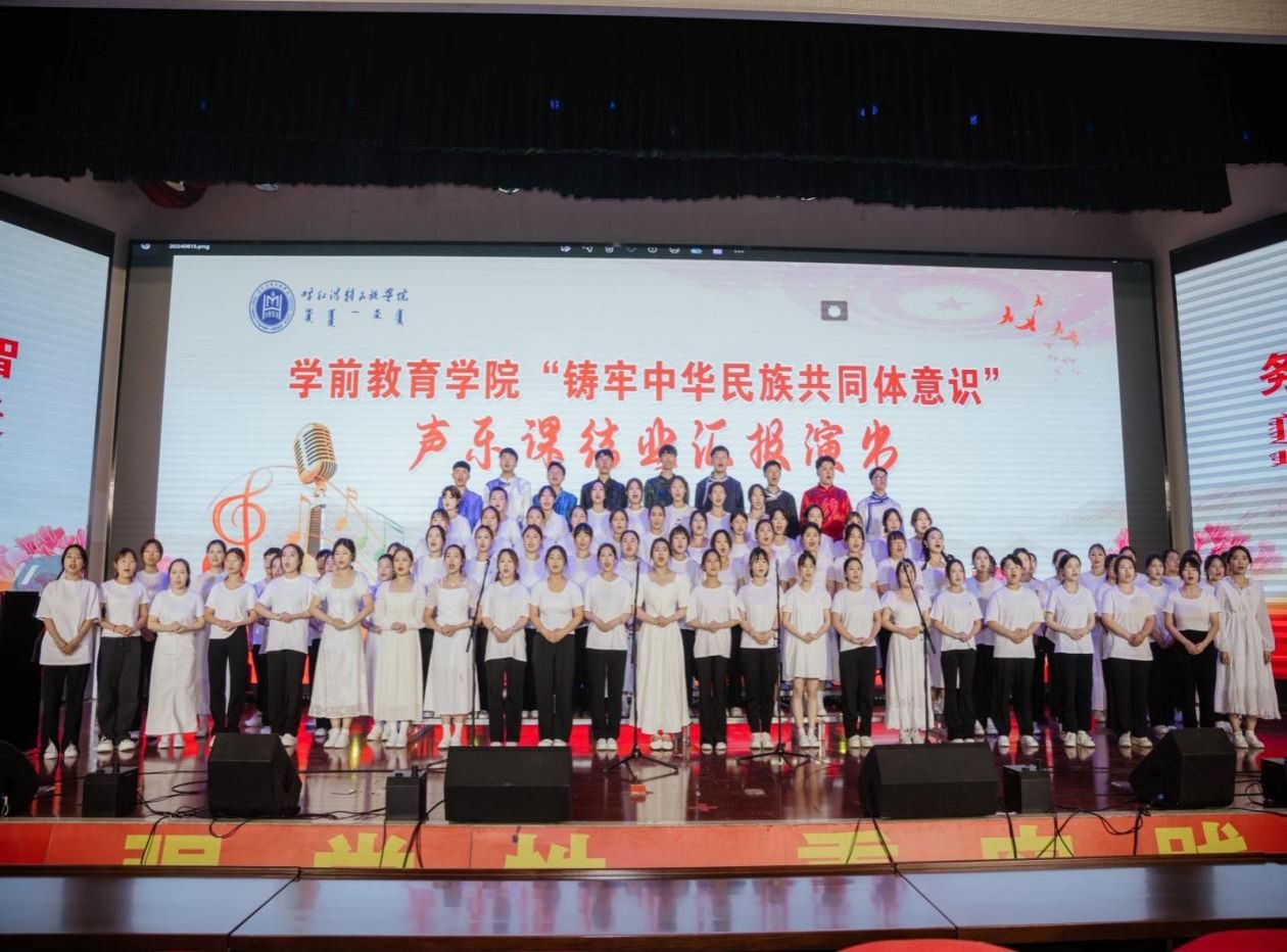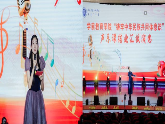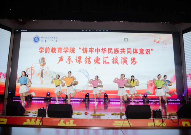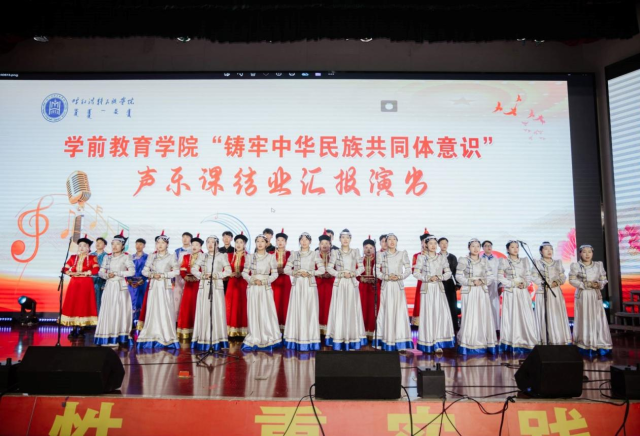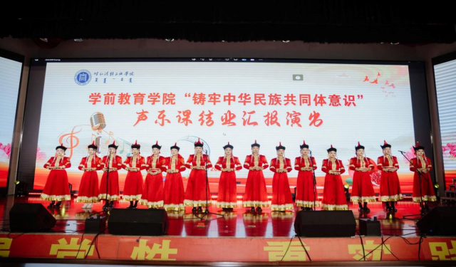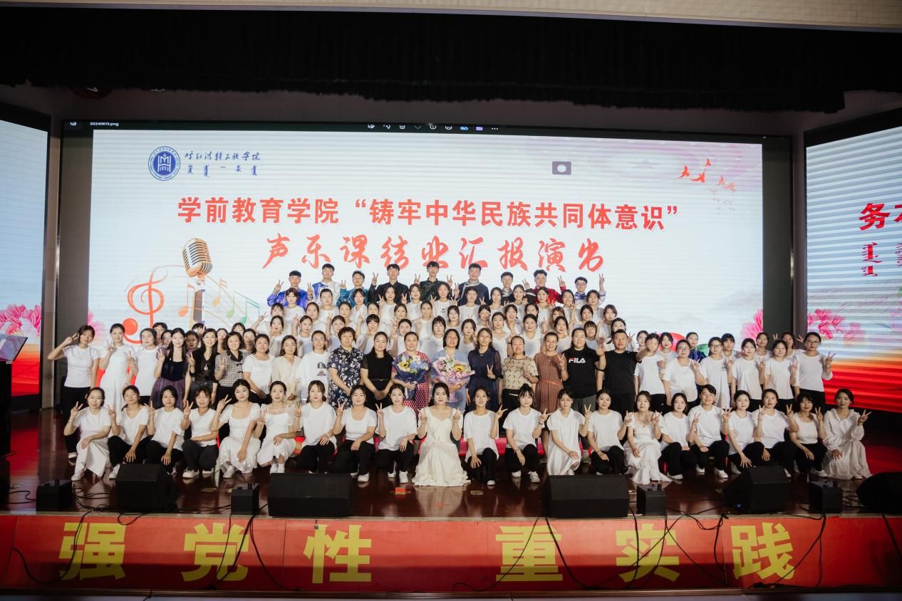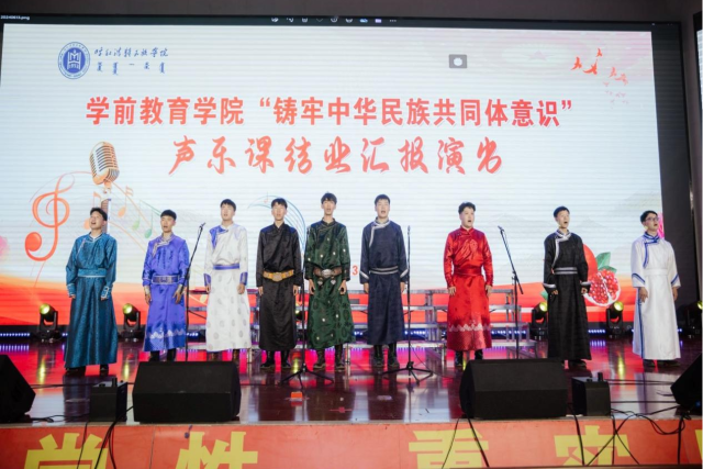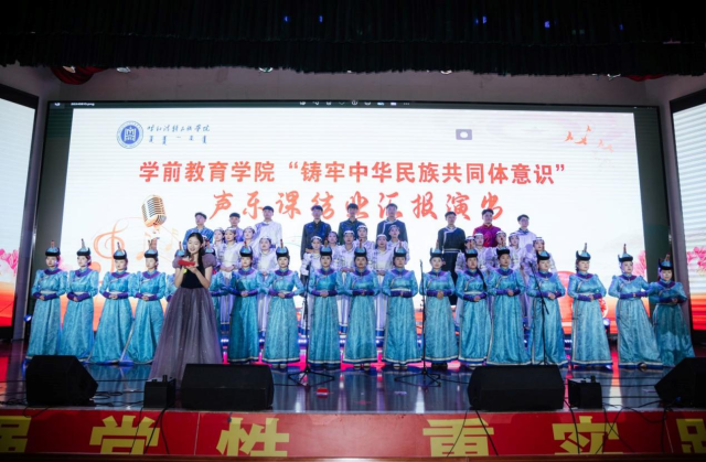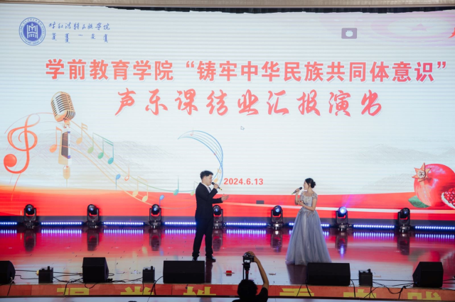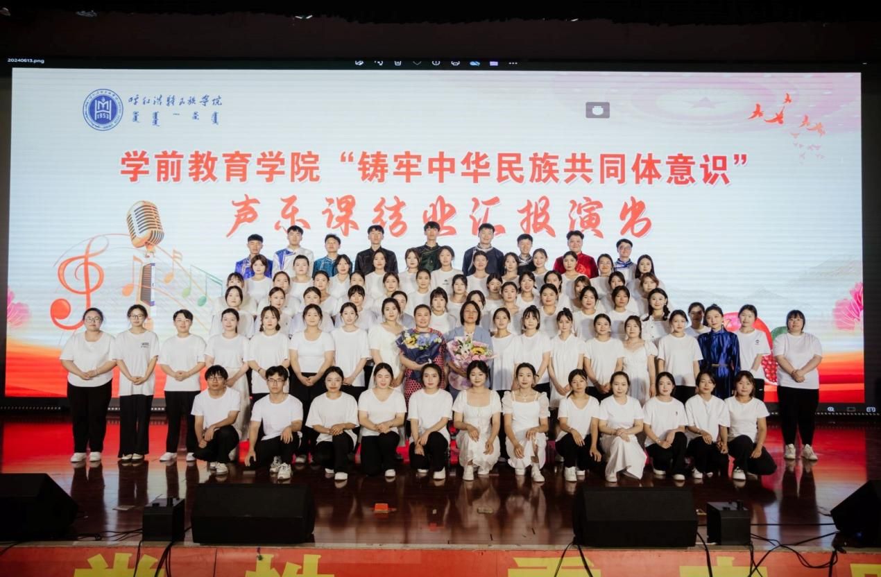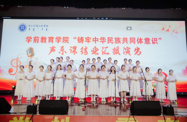 为进一步贯彻落实习近平总书记关于加强和改进民族工作的重要思想,深化米乐官网民族团结进步工作,加强米乐官网师生铸牢中华民族共同体意识教育,学前教育学院2024年6月13日晚19:00时在北图书馆二楼报告厅举办了铸牢中华民族共同体意识主题2021级声乐课结业汇报演出。学前教育学院副院长其其格、新城区第一幼儿园园长计爽,呼和浩特蒙古族第二幼儿园园长乌日勒格以及各二级学院师生共500余人一同观演。本次活动由学前教育学院主办,任课教师萨日胡、梁秀梅老师组织演出。
