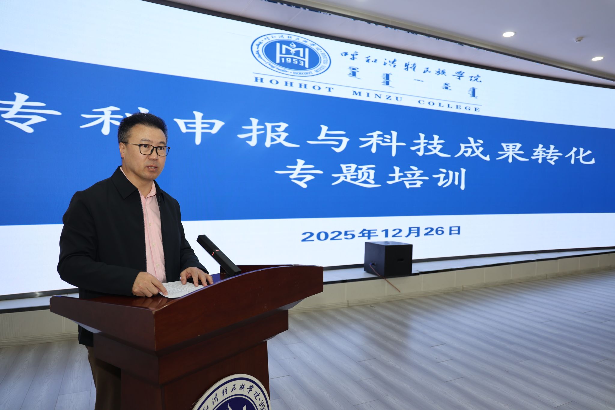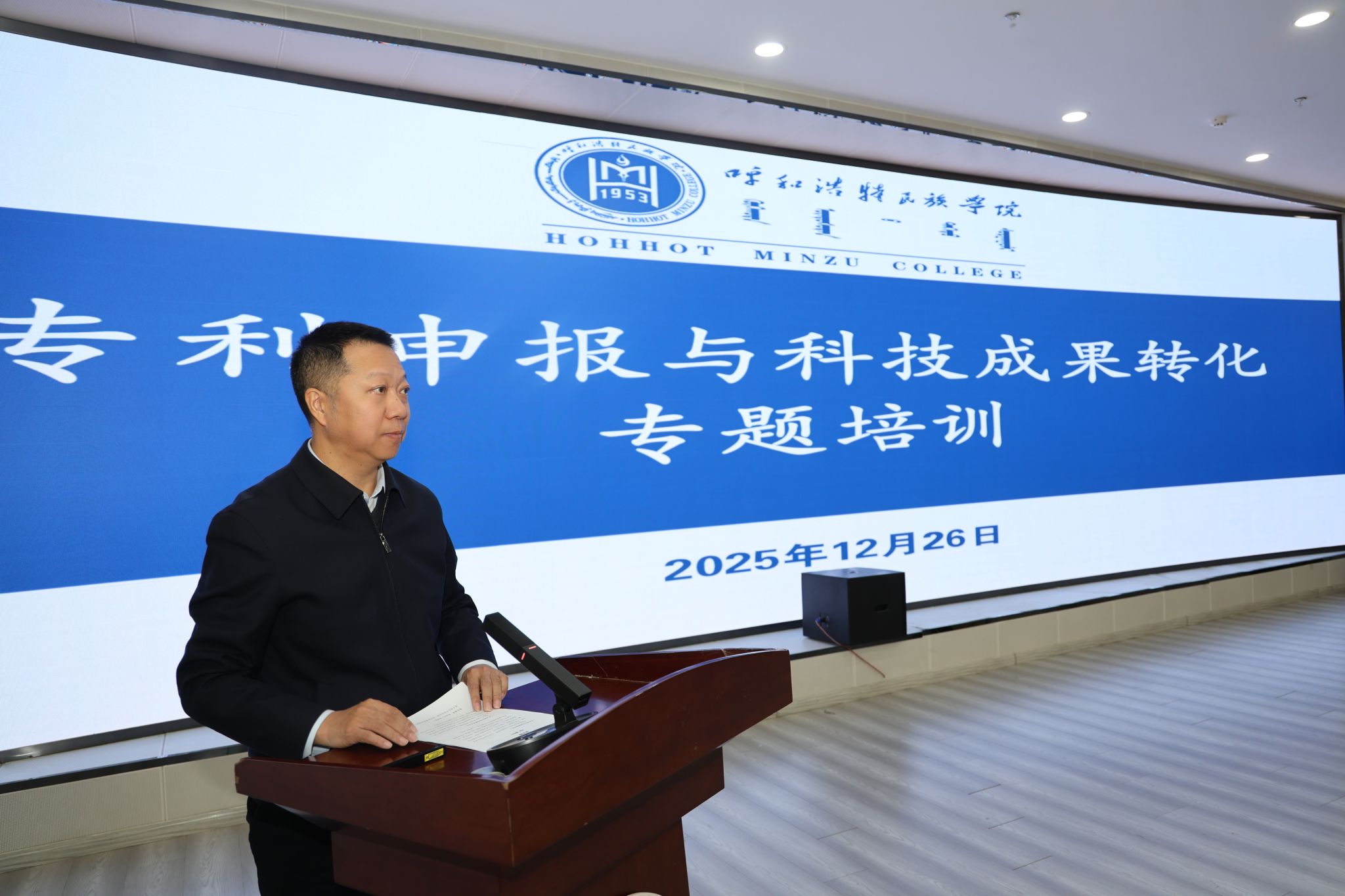 12月26日上午,米乐官网专利申报和科技成果转化专题培训在铸牢教育馆一楼报告厅举行。学校特邀内蒙古工业大学成果转化与产业处处长佐同林副教授、内蒙古硕果知识产权运营有限公司总经理李志强授课。校党委委员、副校长额尔敦布和主持培训并讲话,党委委员、副校长双虎出席活动。