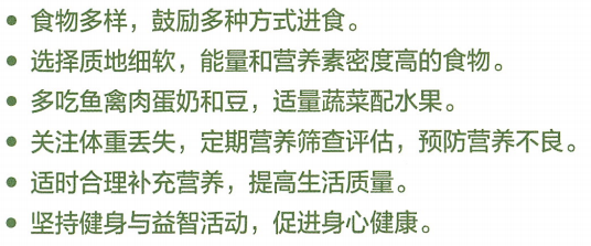 食物应细软,切碎煮烂,不宜提供过硬、大块、过脆、骨/刺多的食物。通过烹调和加工改变食物的质地和性状,易于咀嚼吞咽。进餐次数宜采用三餐两点制,每餐食物占全天总能量:早餐20%~25%,上午加餐5%~10%,午餐30%~35%,下午加餐5%~10%,晚餐25%~30%。