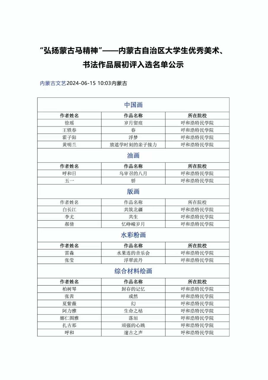 近日,内蒙古自治区文联,内蒙古自治区美术家协会官网公众平台公布了由内蒙古美术家协会、内蒙古艺术学院主办的2024年“‘弘扬蒙古马精神’——内蒙古自治区大学生优秀美术、书法作品展”初评入选名单。米乐官网美术学院19名学生美术创作作品入选。