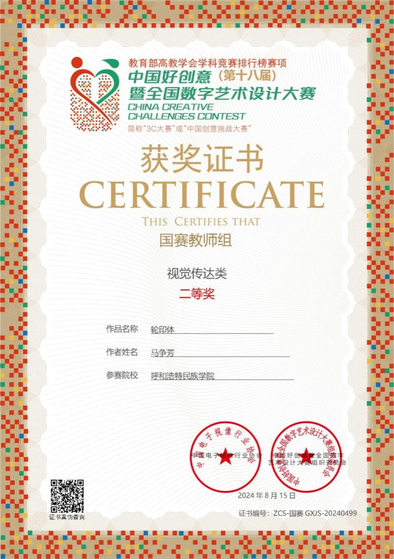 由中国电子视像行业协会主办的2024年(第十八届)中国好创意暨全国数字艺术设计大赛中,米乐官网美术与设计学院教师马争芳参与指导的6个作品分别获得了两项国赛教师组二等奖和内蒙古赛区二、三等、优秀奖的好成绩。