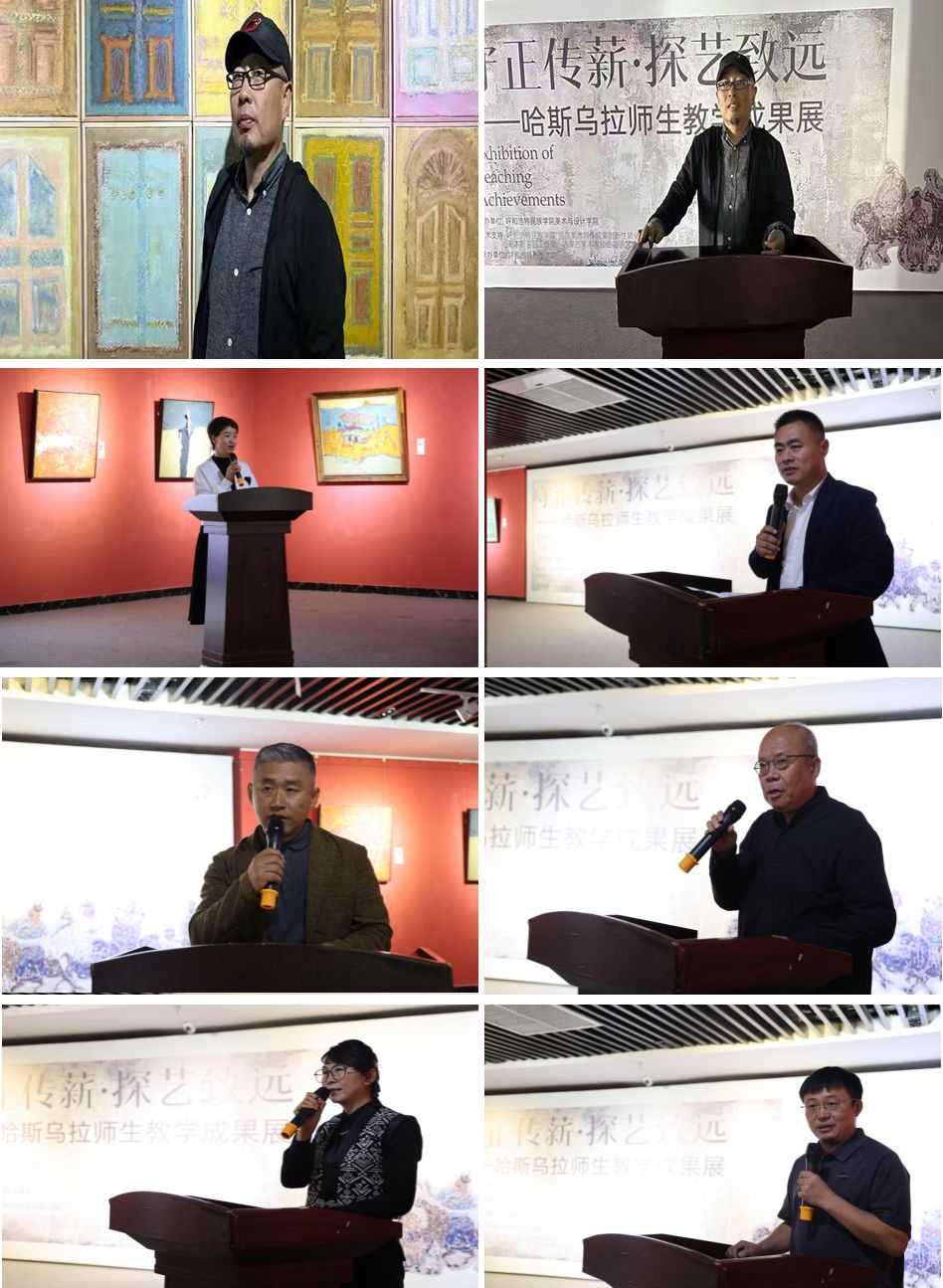 展览以“凝练教学实践”与“传承艺术文脉”为双核驱动力,呈现了一段关于艺术坚守、薪火传递与创新开拓的成长旅程,为区域美育事业发展注入新的活力。开幕式上,美术与设计学院院长高特木乐、内蒙古自治区美术家协会副主席于江、著名评论家,内蒙古艺术学院王鹏瑞教授、呼和浩特市美术馆副馆长郭剑利、现就职于土默特左旗第一小学的学生代表杭盖及哈斯乌拉老师本人先后致辞,共同分享了对美术教育与民族艺术传承的深度思考。