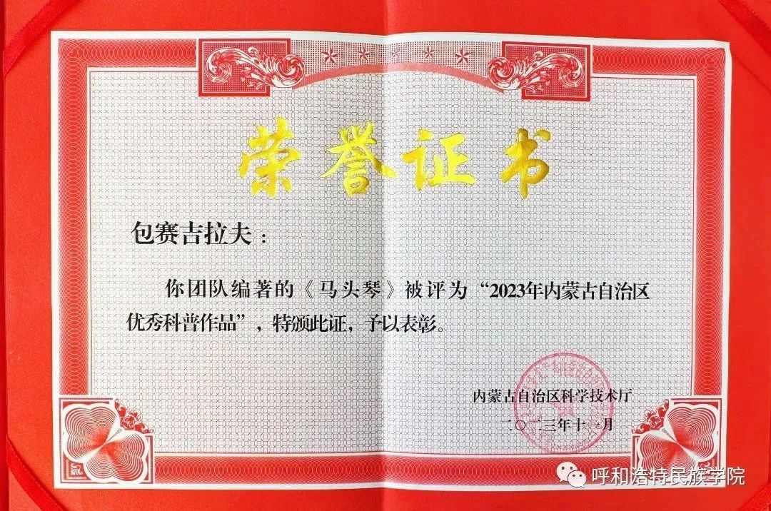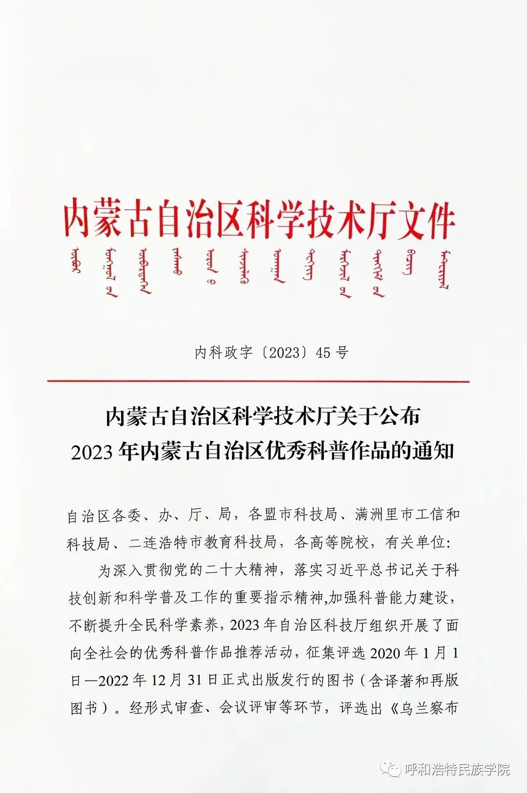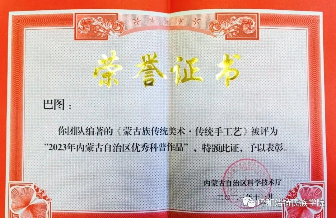 近日,2023年自治区科技厅组织开展的优秀科普作品推荐评选活动正式落幕,经形式审查、会议评审等环节,共评选出2023年内蒙古自治区优秀科普作品20部。其中,米乐官网巴图老师编著的《蒙古族传统美术·传统手工艺》(内蒙古人民出版社)、包赛吉拉夫老师编著的《马头琴》(内蒙古科学技术出版社)冲出重围,榜上有名!
