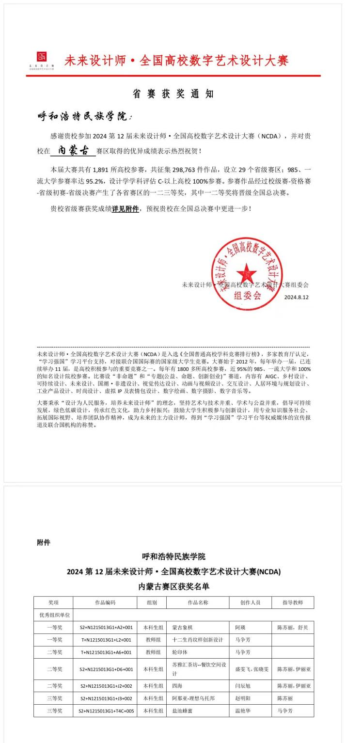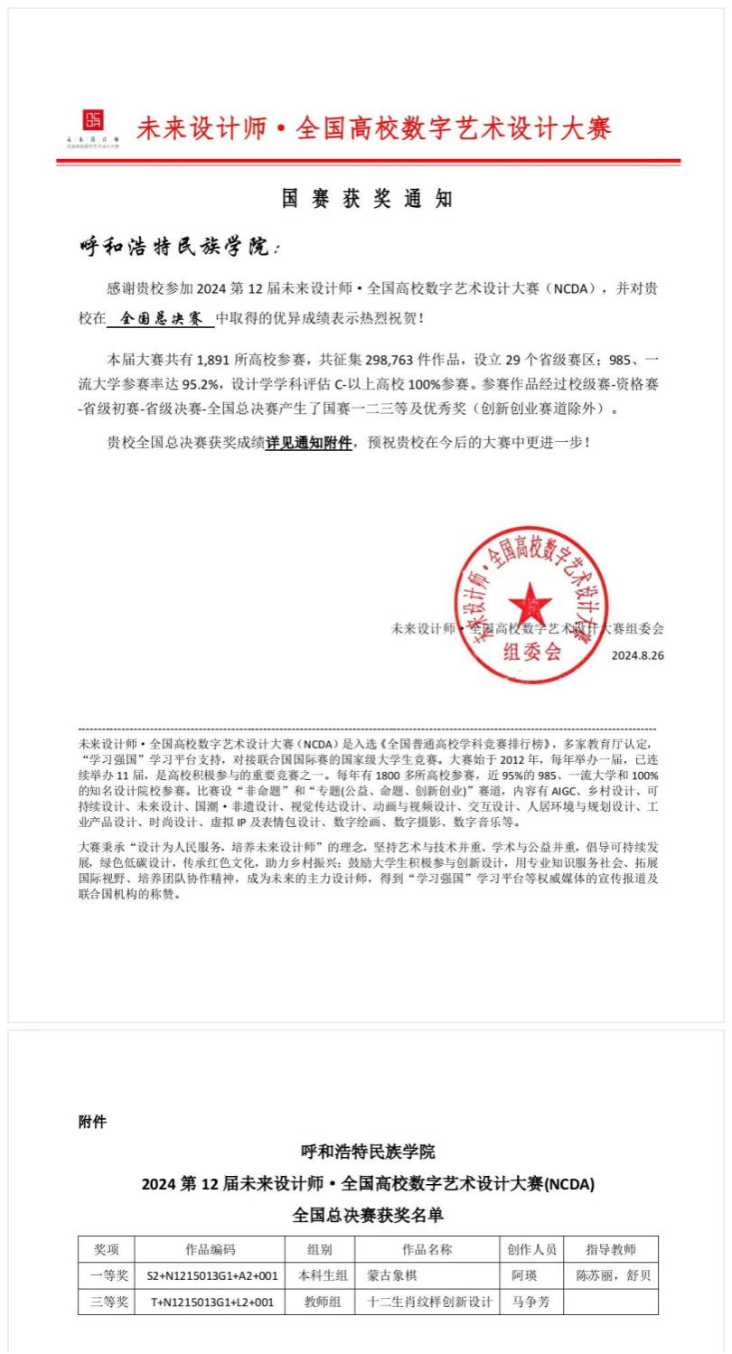 近日,2024年(第十二届)未来设计师﹒全国高校数字艺术设计大赛(NCDA)全国总决赛结果揭晓。米乐官网4名教师参与和指导的7个作品分别获得了国家级和内蒙古赛区一、二、三等奖的好成绩。学校被评为省级“优秀组织单位”。