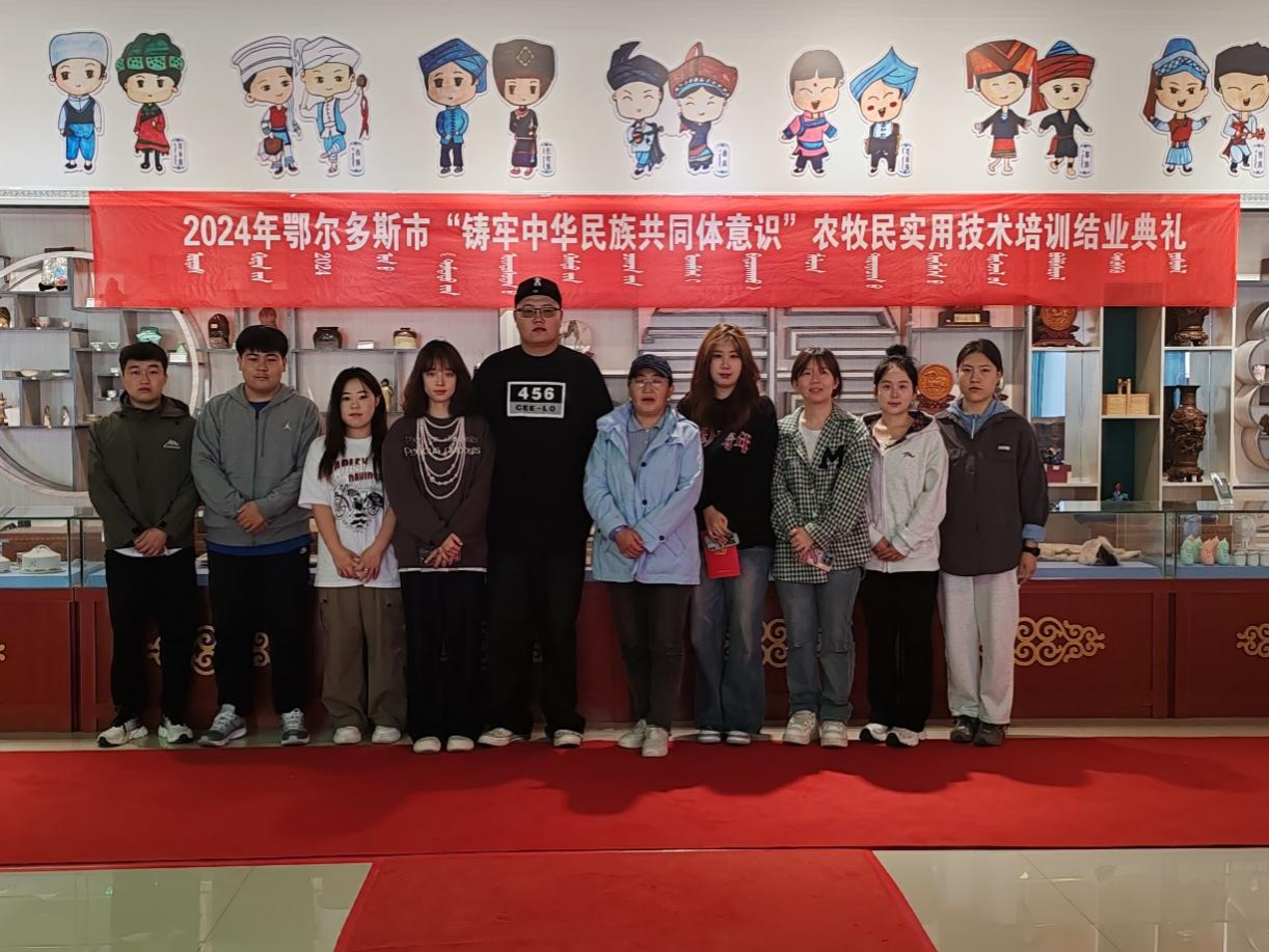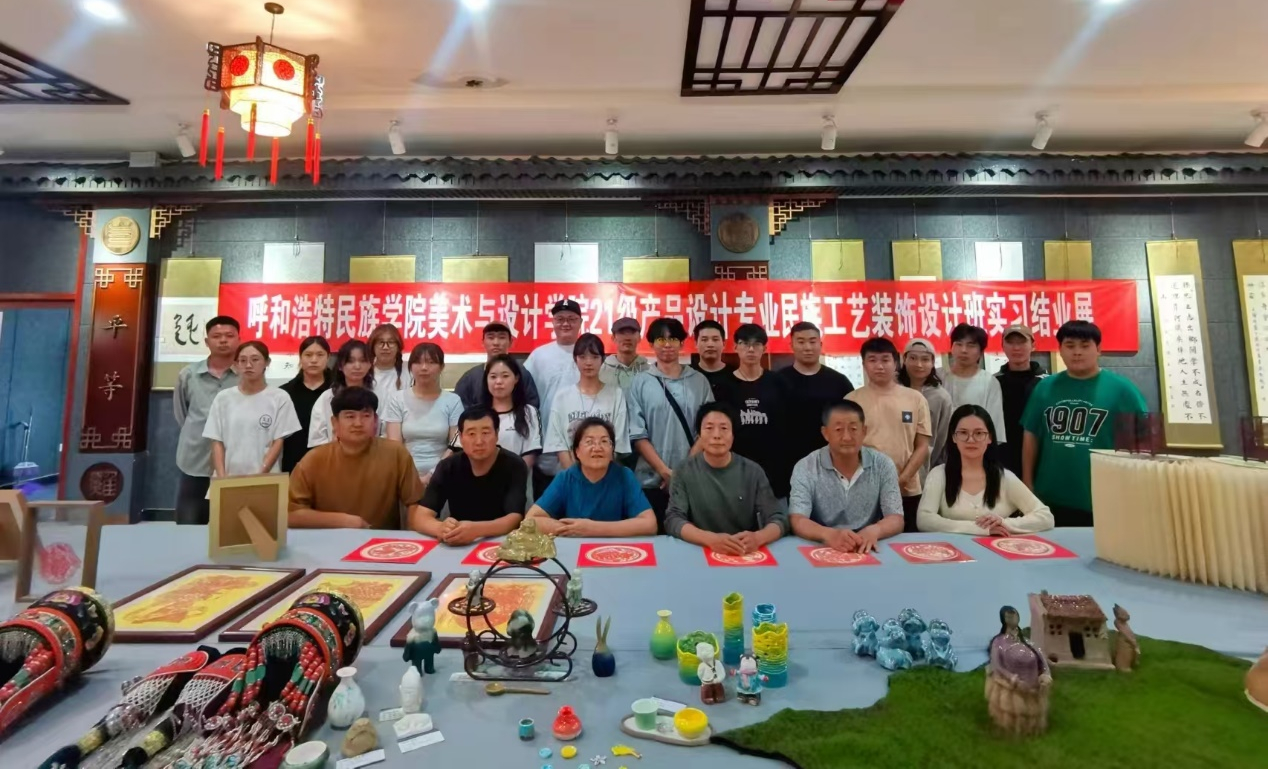 2021级产品设计专业学生在导师萨仁图雅的带领下前往鄂托克前旗职业中学,参与2024年鄂尔多斯市“铸牢中华民族共同体意识”农牧民实用技术培训活动,为当地农牧民带去知识服务、设计理念和技能的同时,也认识到艺术设计在基层经济发展与民族团结进步中的重要作用。同学们通过体验传统工艺的制作流程,将现代设计元素巧妙融入其中,以新的视角和“设计+手工”的实践方式,动手制作了蒙古族头饰、皮雕作品、陶艺作品等极具民族特色的艺术品,与当地文化产生深度互动,加深了解、感受传统文化艺术丰富内涵的同时,增强了传承,弘扬传统文化艺术的责任感和使命感。
