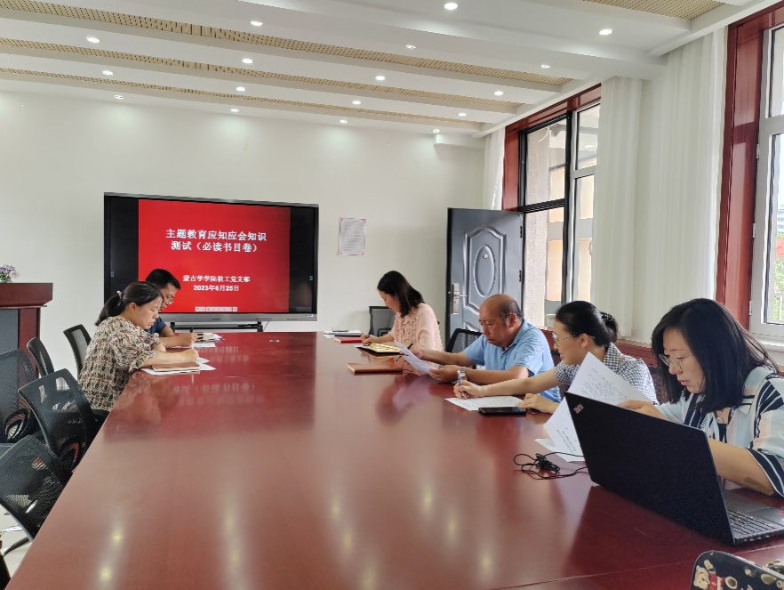 蒙古学学院教工党支部开展第二次主题教育应知应会测试 2023-06-25 党建工作 次 为检验主题教育学习成果,6月25日,蒙古学学院教工党支部围绕学习贯彻习近平新时代中国特色社会主义思想主题教育(必读书目卷)内容开展应知应会测试。 以考促学强基础,以学致用促提升。此次知识测试的开展,充分调动了党员干部职工学习的积极性和主动性,进一步提高了理论知识水平。蒙古学学院教工党支部将以此次测试为契机,将主题教育融入日常、抓在经常,不断使学习成果切实转化为推动米乐官网高质量发展的实际成效,持续推进主题教育走深走实。