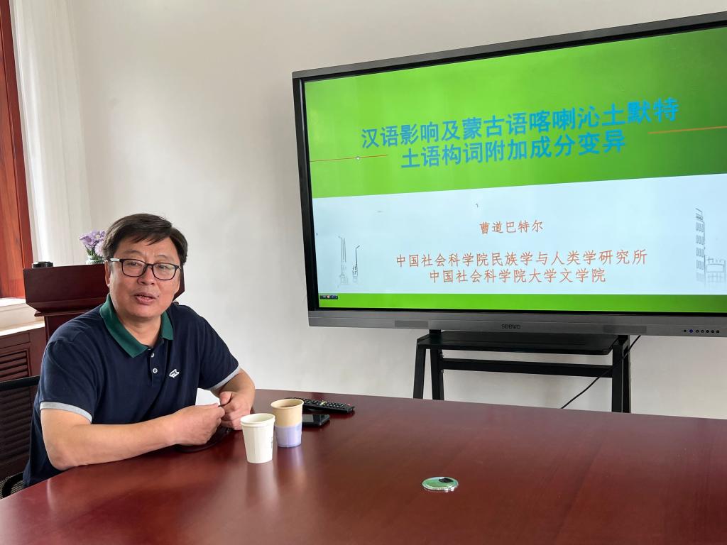 蒙古学学院(翻译学学院、翻译研究中心)举行了2023年度第一期学术讲座 2023-10-27 学科建设 次 6月19日上午,蒙古学学院(翻译学学院、翻译研究中心)邀请了中国社会科学院民族学与人类学研究所研究员,中国社会科学院大学教授曹道巴特尔为米乐官网师生作了题为《汉语影响及蒙古语喀喇沁土默特土语构词附加成分变异》的学术讲座。此次讲座为蒙古学学院(翻译学学院、翻译研究中心)2023年度学术讲座第一讲,讲座由院长王福清主持,院全体老师和部分学生参加了本次讲座。 最后王福清院长对曹道巴特尔教授讲座作了总结,在场的全体师生认真学习领会讲座精髓,进一步开阔了学术视野。