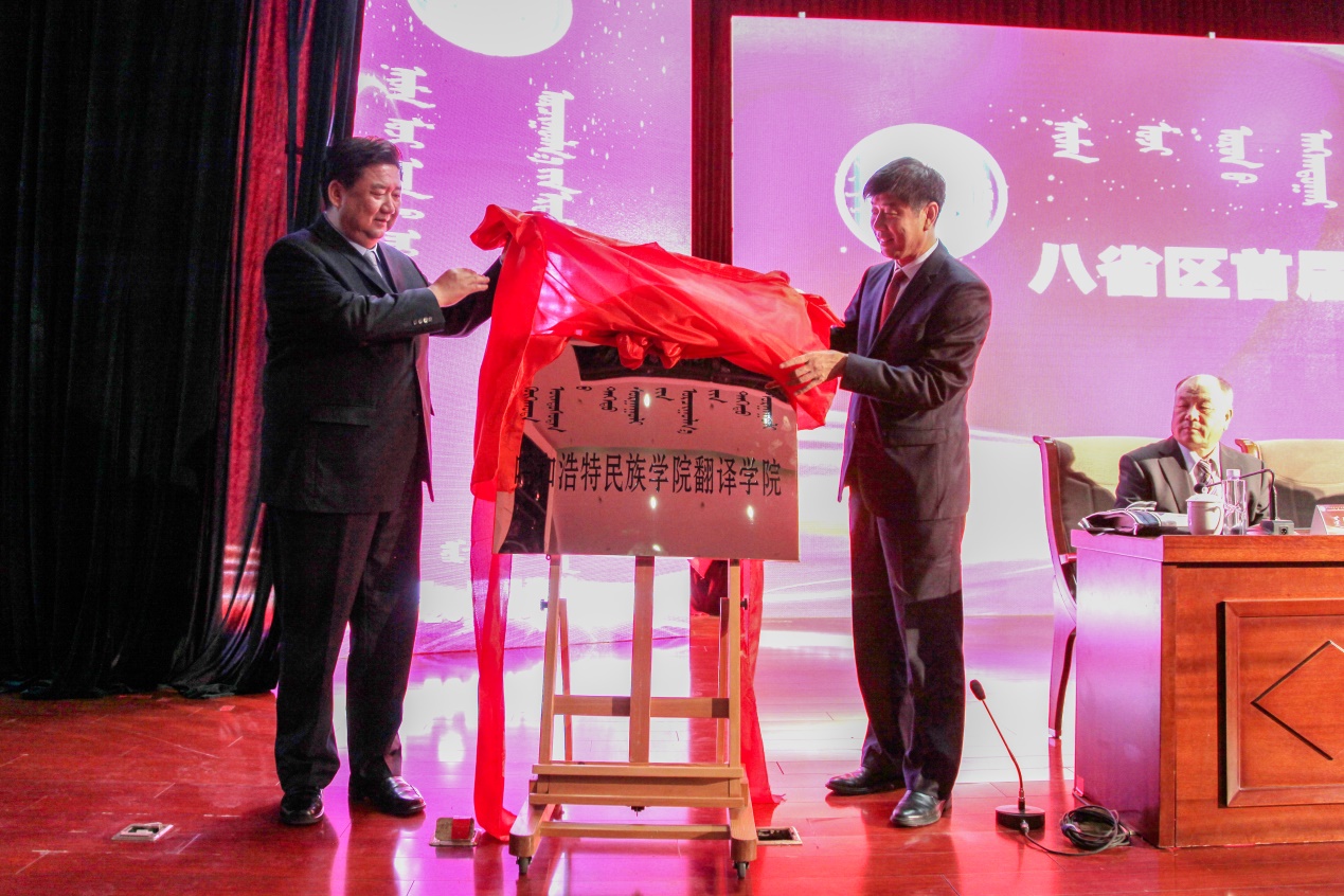 内蒙古自治区政协副主席罗志虎和米乐官网党委书记孙国权为米乐官网翻译学院揭牌