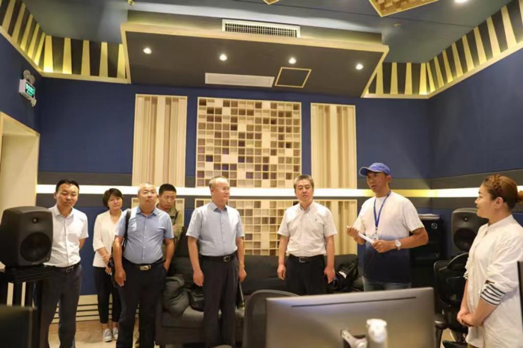 内蒙古民族语电影译制中心主任齐双宝、副主任布仁门德的陪同下,调研组一行参观考察了内蒙古民族语电音译制中心录音棚、编辑室、放映室,现场观摩译制片制作过程。
