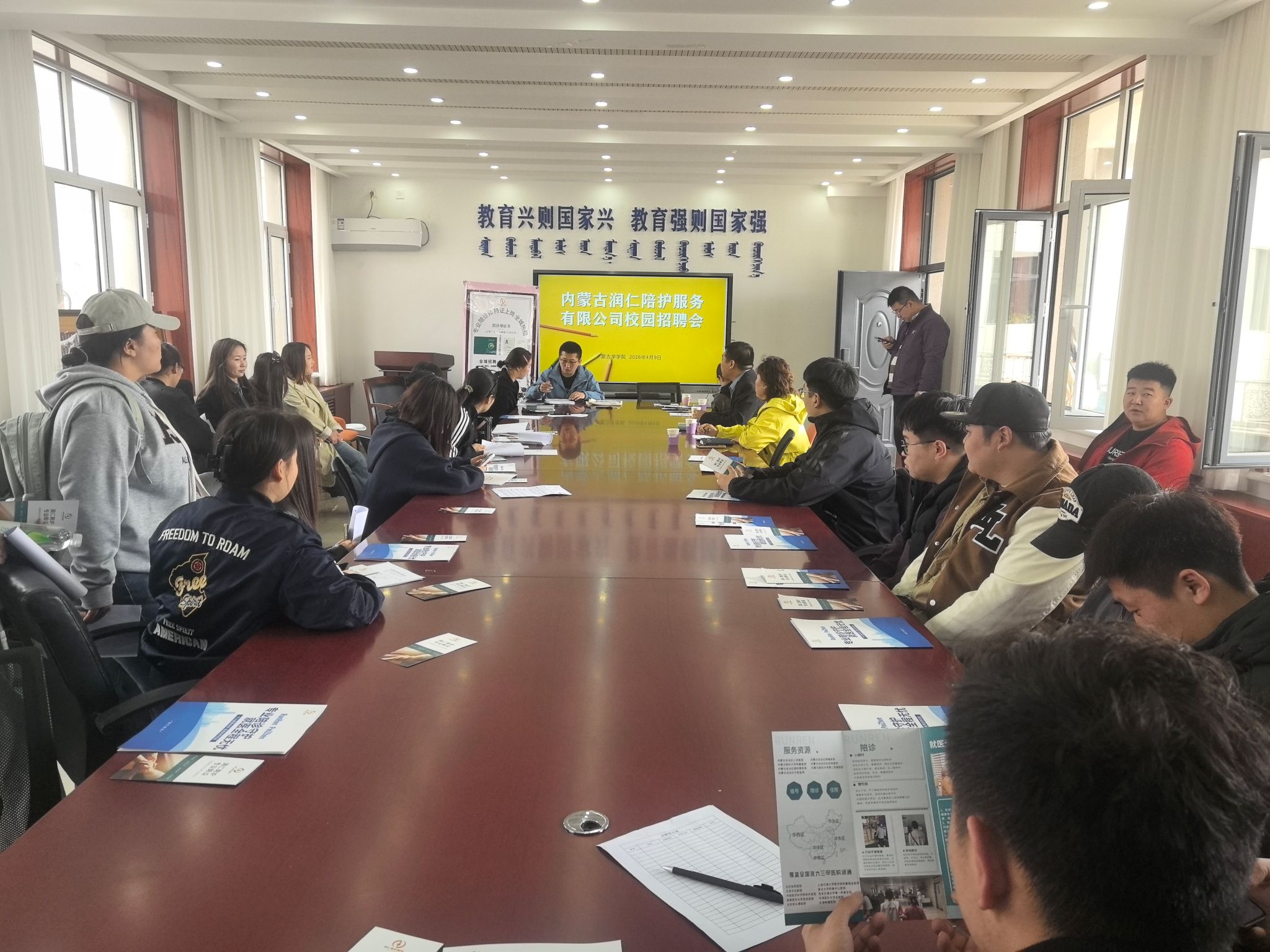 内蒙古润仁陪护服务有限公司代表详细介绍了公司的发展现状、业务板块、人才需求、薪资待遇以及人才培养机制等基本情况。他表示希望通过此次入校招聘能够招纳更多呼民院学子来企业发展。
