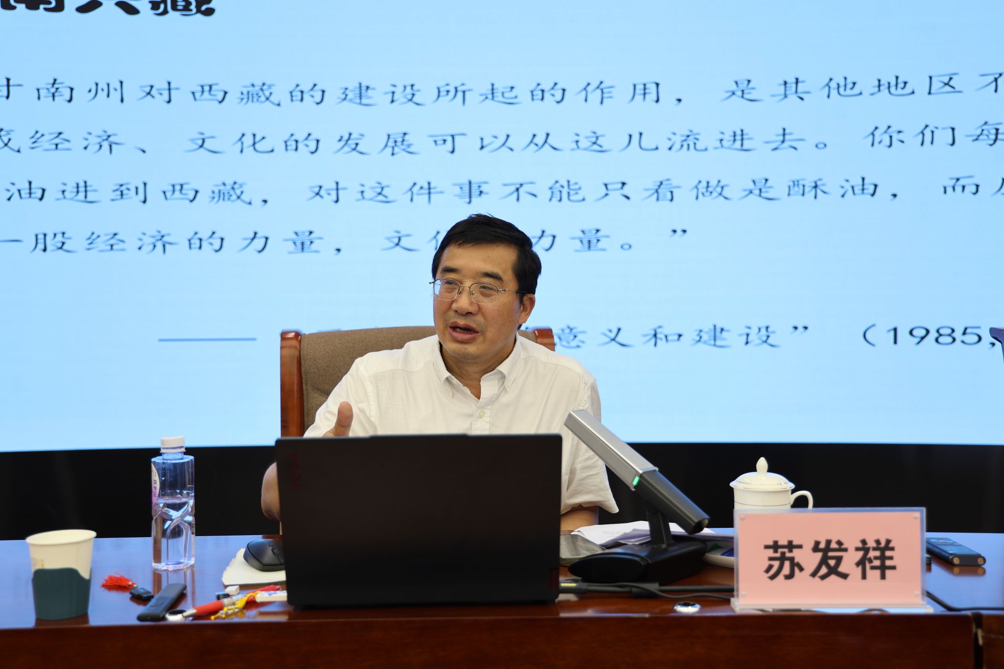 苏发祥以“两个世纪,一个心愿:费孝通甘、青地区的社会调查及其研究”为题作学术讲座。苏发祥以详实的数据和文献资料重新梳理了我国著名民族学家费孝通先生从1984年开始先后13次赴甘肃、青海地区进行实地考察并撰写系列调查报告的经历,并高度评价了费先生为当地社会经济的发展出点子、找路子,继续其“志在富民”思想的学术实践。他认为,费先生在甘肃、青海地区的社会调查跨越了两个世纪,延续了其自20世纪30年代以来对中国社会现代化问题的关注,他的心愿只有一个就是“志在富民”,为西北地区的现代化贡献智慧。苏发祥认为,费孝通甘肃、青海地区的调查以宏观着眼,微观入手,充分体现了其深厚的学术功底和一以贯之的家国情怀,对今天推动实现中国式现代化的实践和西部大开发的全面推进,仍有积极的指导和借鉴意义。