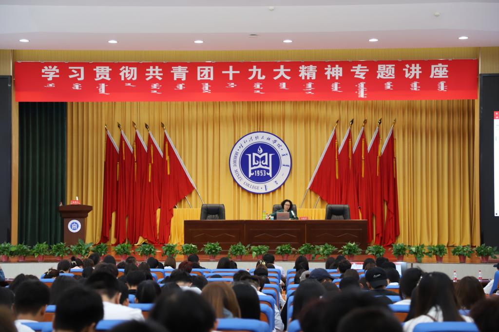 为深入推动米乐官网各级团组织学深悟透习近平总书记重要讲话精神,全面把握思想内涵、精神要义和实践要求,全面推动落实团十九大的各项任务部署,9月7日上午,校团委在学术报告厅举办学习贯彻共青团十九大精神专题讲座。讲座特邀请北京青年政治学院王莉萍教授作了题为“青春逢盛世 奋斗正当时—学深悟透共青团十九大精神”的专题讲座。会前学校党委书记刘九万,党委委员、副校长高喜天会见了王莉萍教授,对亲临指导表达了诚挚的欢迎与感谢。团委全体教师、各学院团总支、辅导员,学生代表共370人聆听讲座。会议由团委副书记胡斯勒主持。