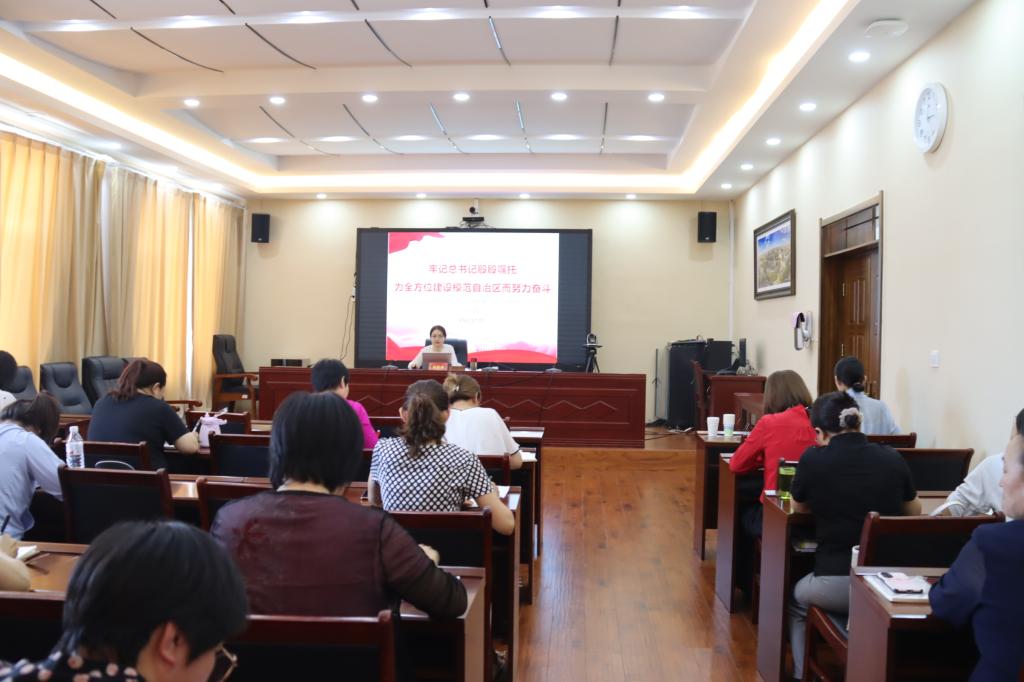 根据学习贯彻习近平新时代中国特色社会主义思想主题教育总体安排,7月17日下午,校党委副书记胡春梅在办公楼四楼会议室以“牢记总书记殷殷嘱托 为全方位建设模范自治区而努力奋斗”为题,为党委宣传部、马克思主义学院、学前教育学院、基础教育学院全体党员干部讲授专题党课。