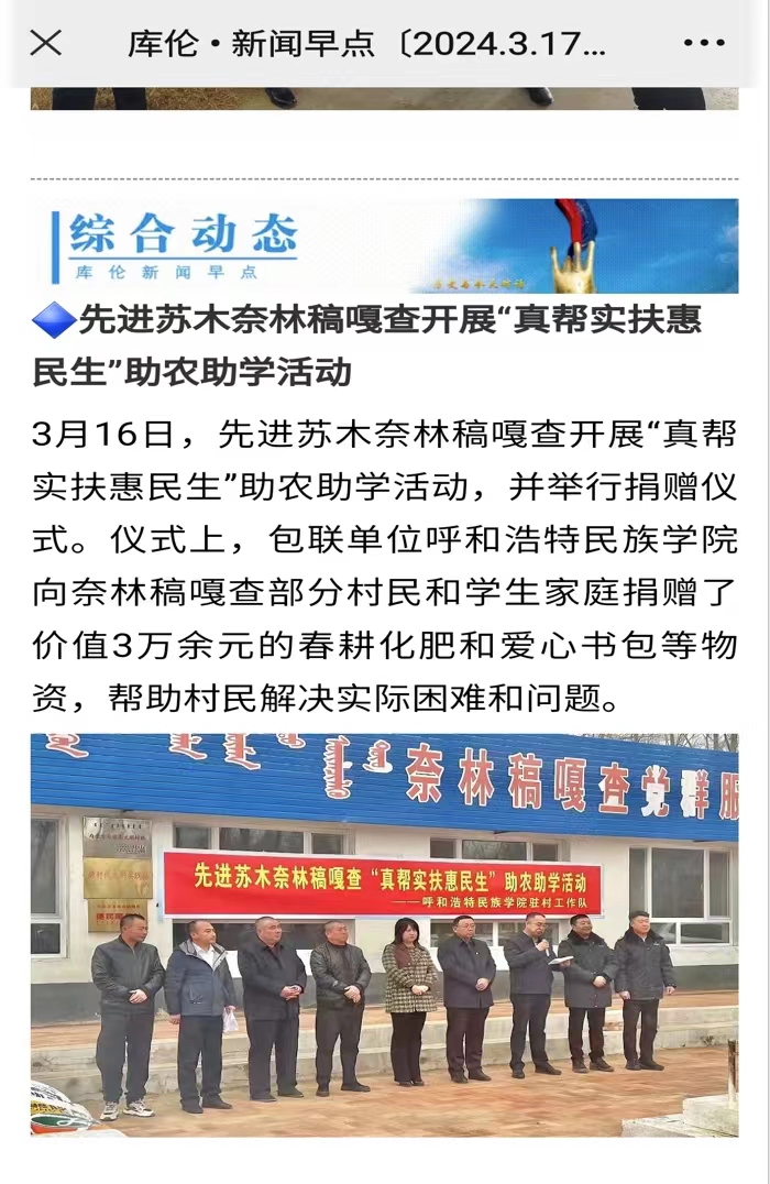 此次活动,充分体现了学校对奈林稿嘎查村民的真心实意的帮助和支持,让村民深刻体会到包联单位对奈林稿嘎查的关心、爱心,增强了村民自强不息,以脚踏实地的拼劲、韧劲、干劲实现梦想的信心。