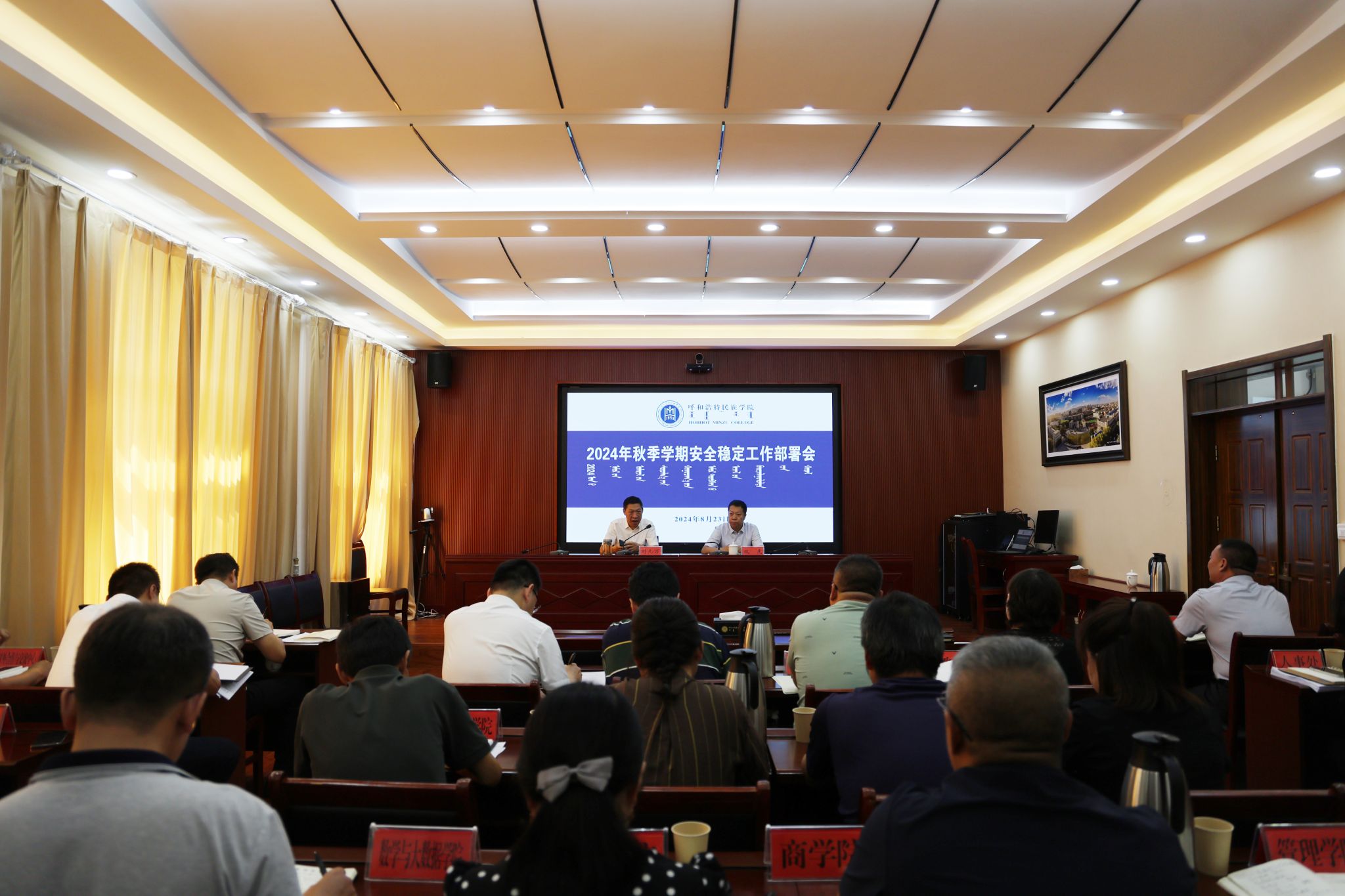 8月23日,为及时传达全区教育系统安全稳定工作视频会议精神,确保新学期校园安全稳定,校党委书记刘九万在办公楼四楼会议室主持召开2024年秋季学期安全稳定工作部署会。校党委委员、副校长双虎出席会议。