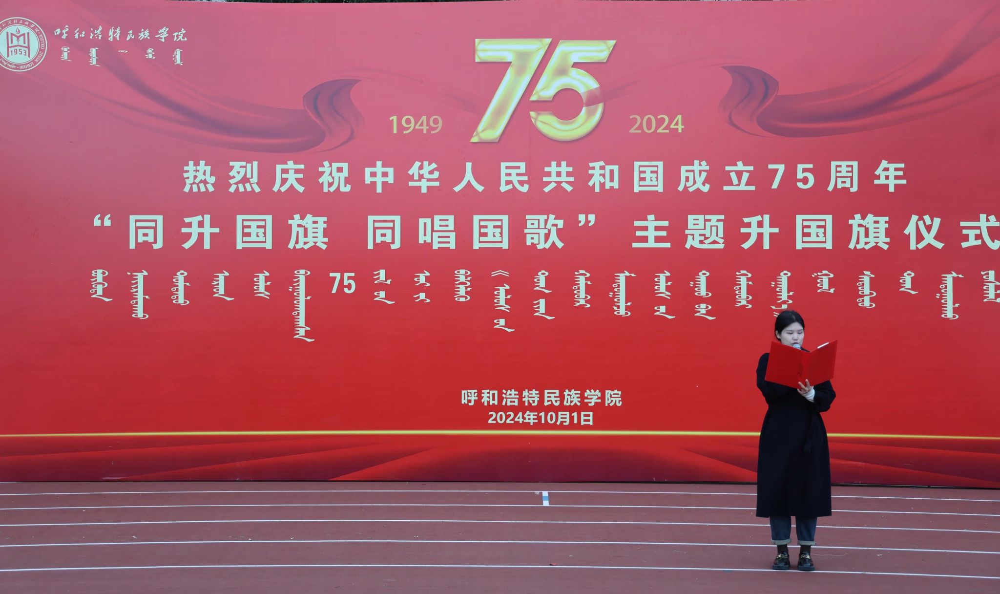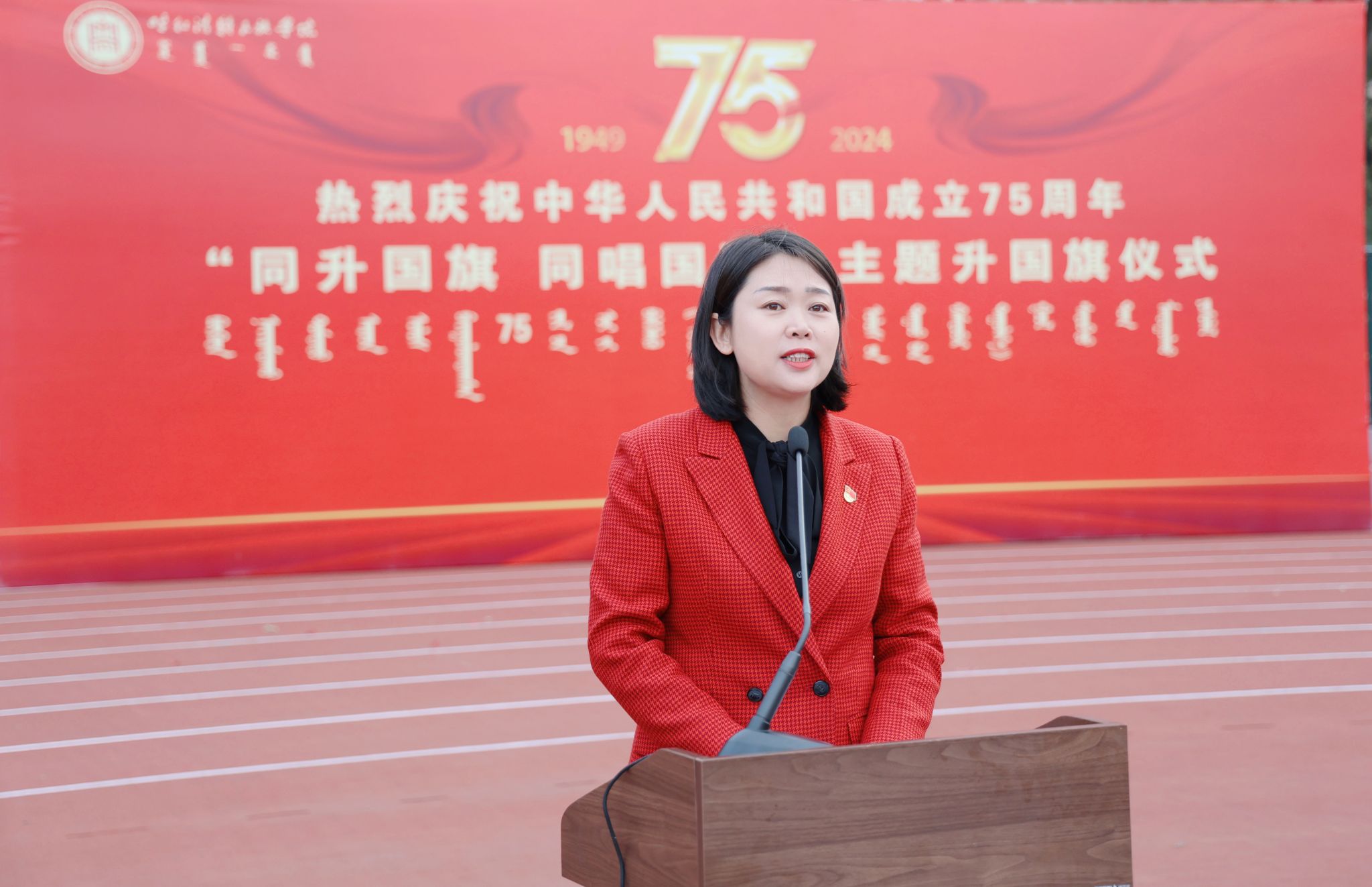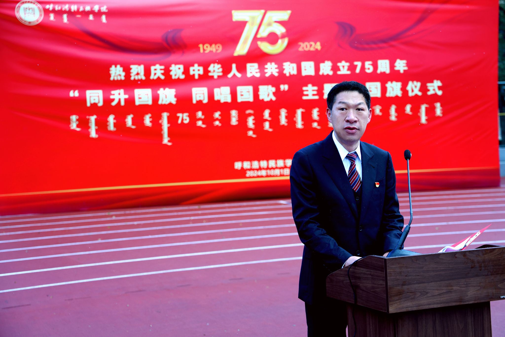 10月1日清晨,学校在南操场举办庆祝中华人民共和国成立75周年“同升国旗,同唱国歌”升国旗仪式。校党委书记刘九万出席仪式并讲话,党委委员、纪委书记、监察专员王冬梅,党委委员、副校长高喜天,党委委员、副校长刘瑞鸿,党委委员、副校长额尔敦布和,党委委员、副校长双虎等全体校领导出席仪式。仪式由校党委副书记格根哈斯主持。