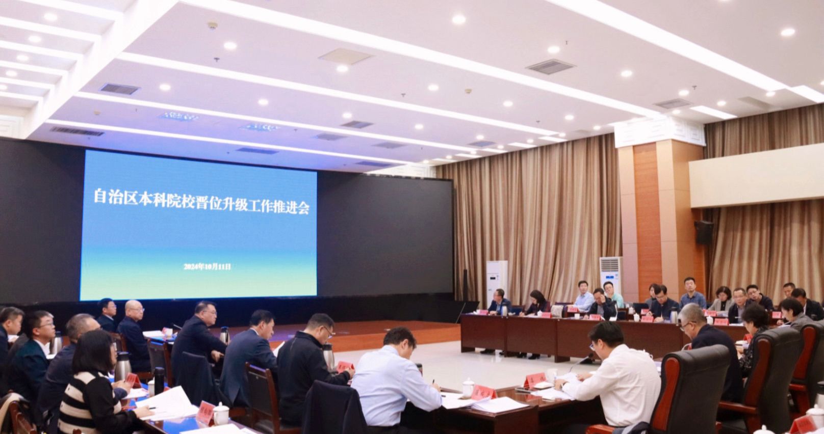 为深入贯彻落实党的二十届三中全会和全国教育大会精神,推动自治区高校高质量发展,10月11日,自治区教育厅召开全区高校晋位升级工作汇报会。自治区政协副主席,自治区党委教育工委书记、教育厅党组书记、厅长杨劼出席会议并讲话。自治区党委教育工作委员会委员、自治区教育厅党组成员、副厅长李伟主持会议。自治区教育厅领导班子成员、自治区党委组织部有关同志,教育厅相关处室领导及全区9所本科院校主要负责同志及相关部门负责人参加会议。